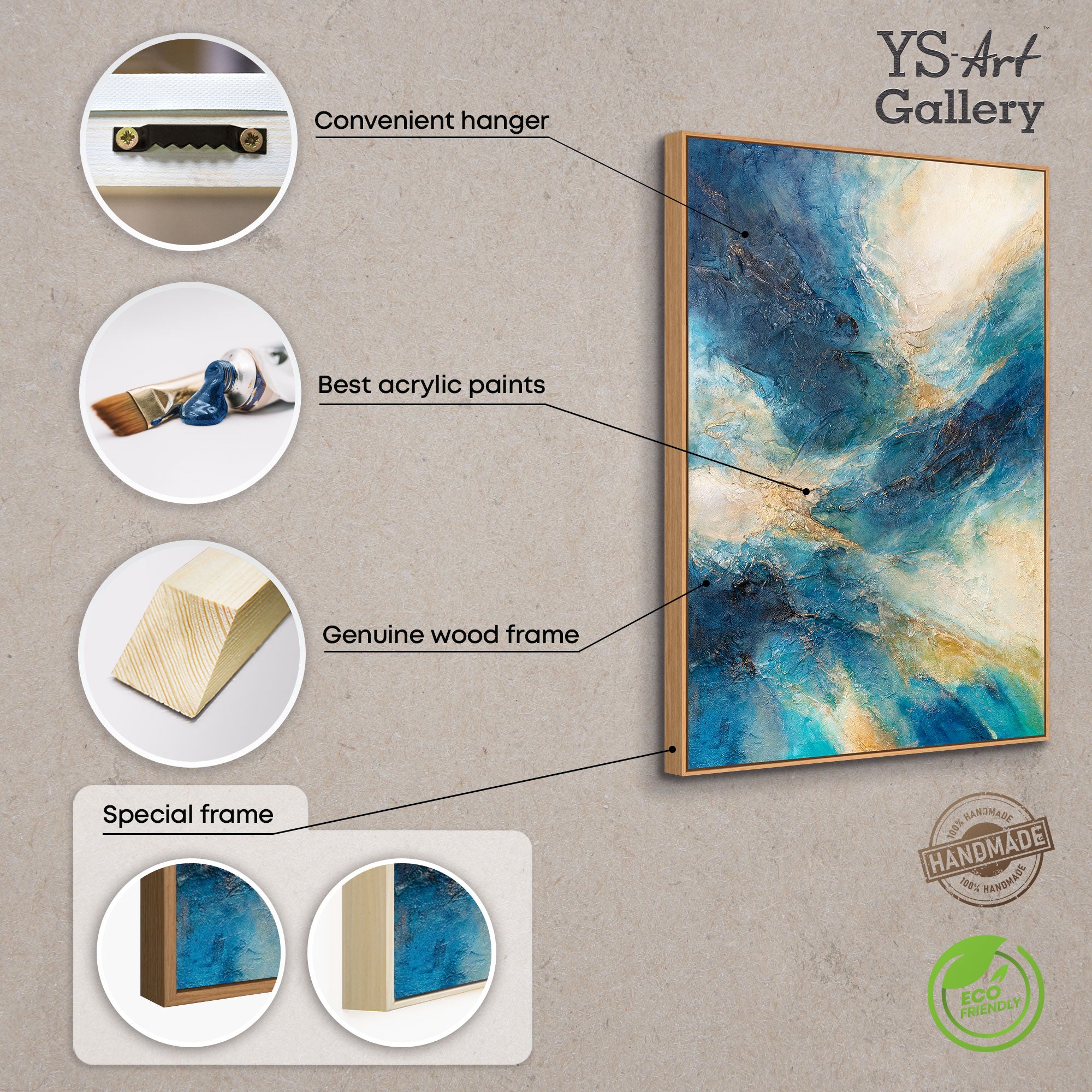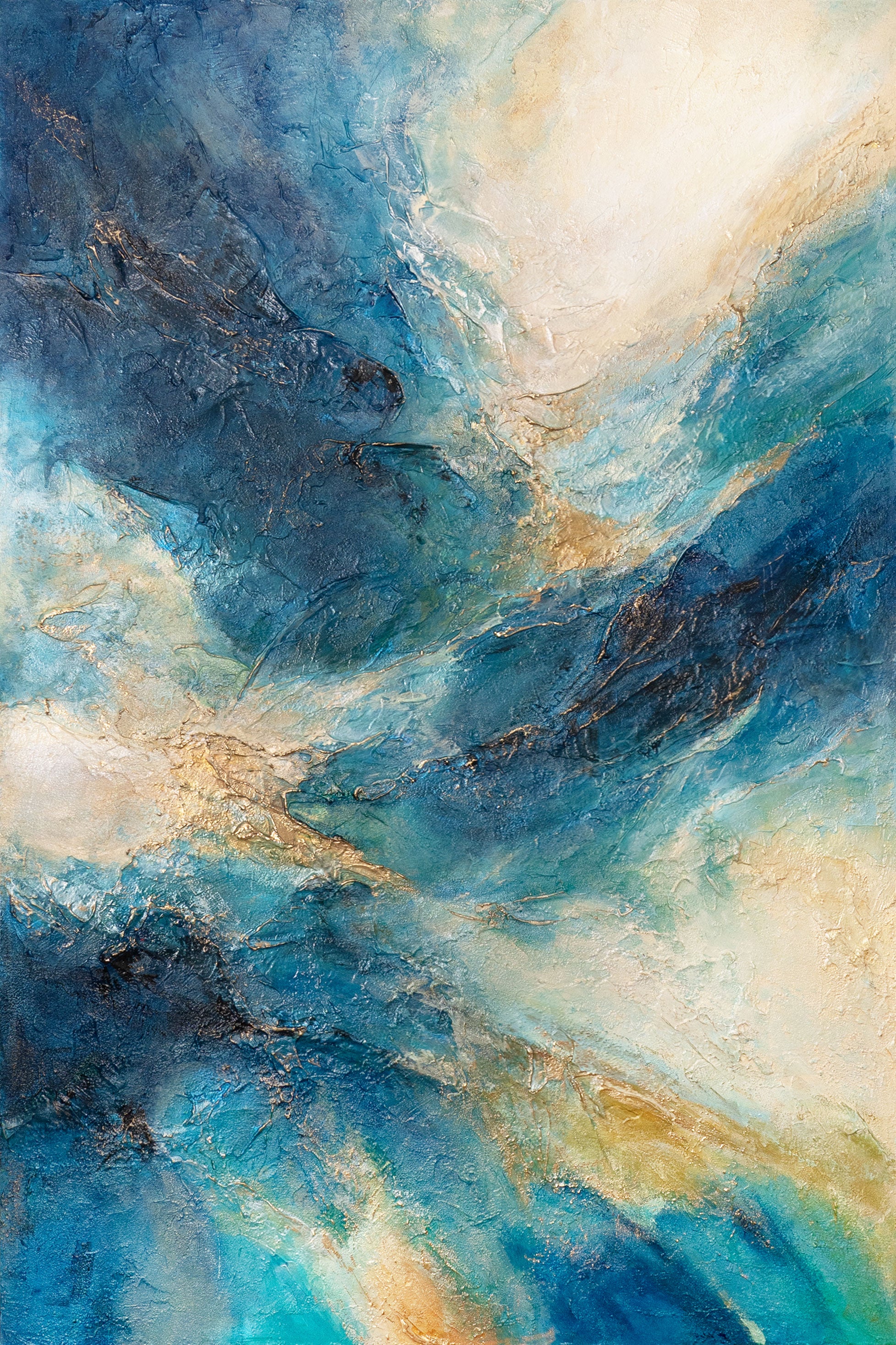 Dive into the depth of the ocean with the hand-painted canvas painting "Shine of the Waves." Powerful shades of Blue merge with soft White and golden accents, resembling light reflections on the water's surface. The textured surface adds depth and dynamism, making it a true focal point.