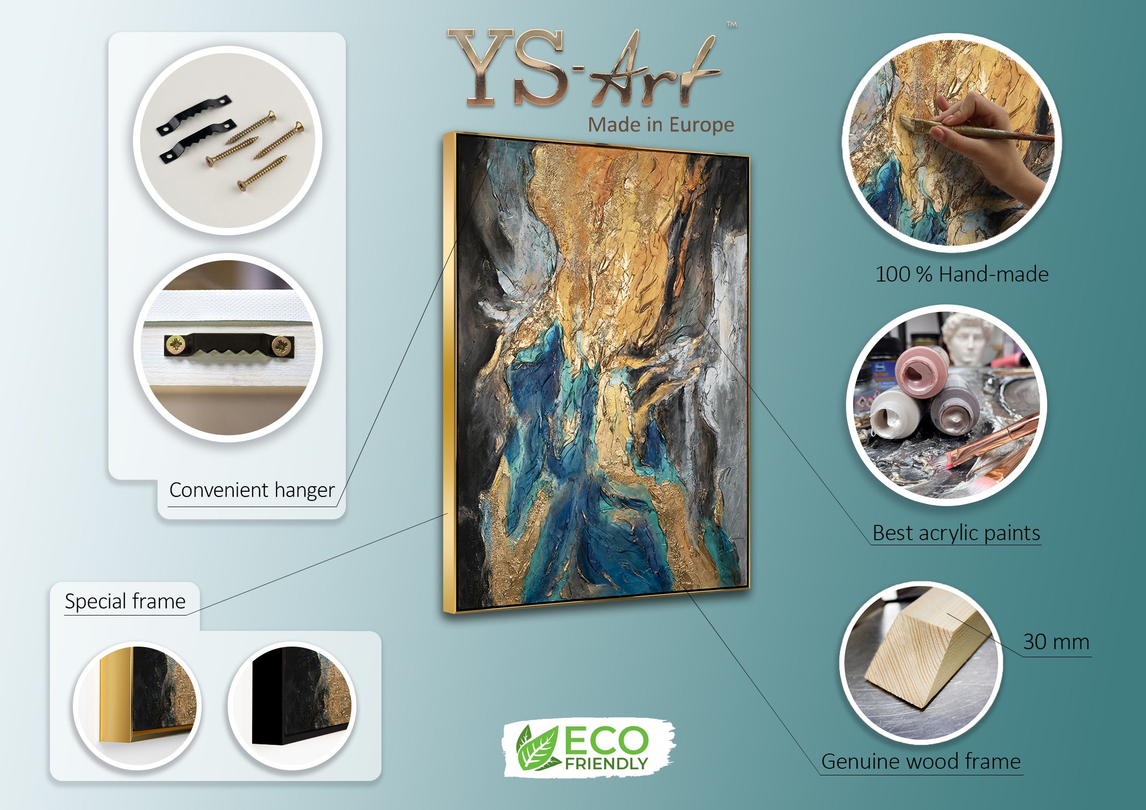 This piece of art not only represents the diversity of modern abstract art but also stands for craftsmanship excellence. We use only high-quality acrylic paints to guarantee the brilliance and durability of the colors as well as the consistency of the texture. To maintain the beauty of the framed modern paintings for the living room, we advise you to place it away from direct sunlight and to clean it carefully with a soft, dry cloth from time to time.