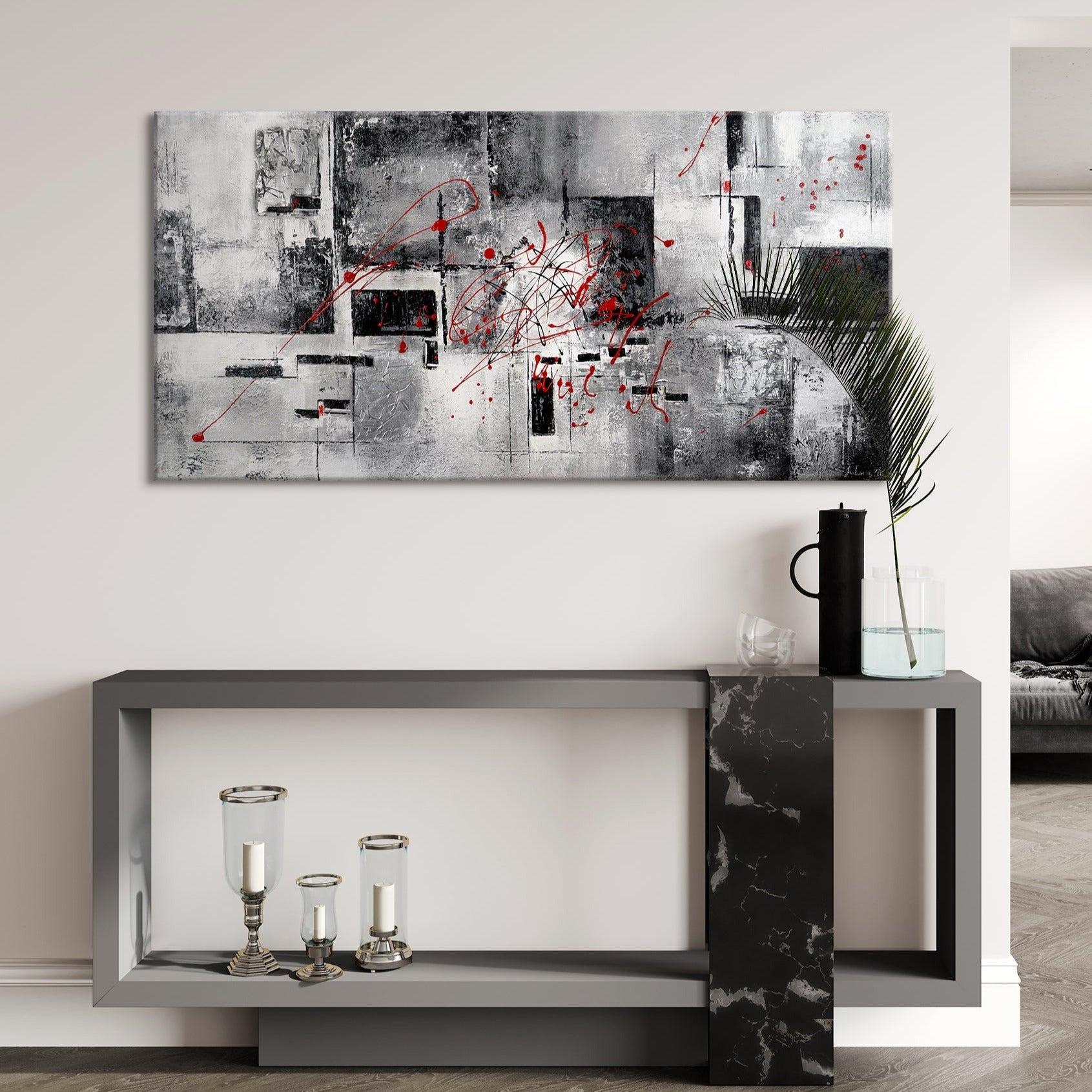 A canvas painting in gray tones with a red accent ideally fits into the interior of a city apartment or a country house, a living room or a study.