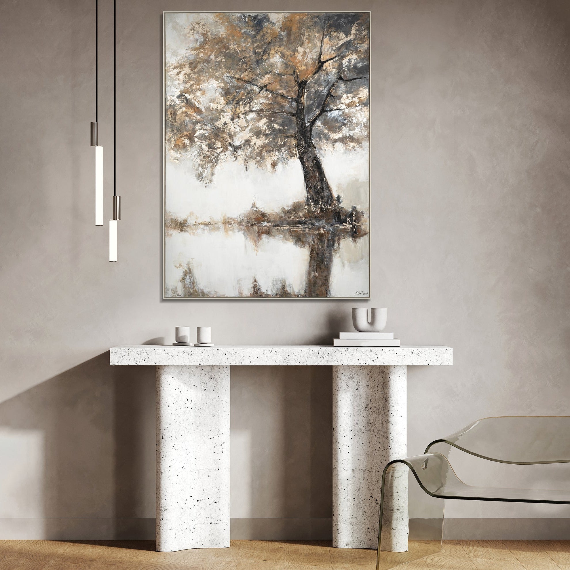 Discover the beauty of hand-painted paintings on canvas with our exclusive acrylic painting, which depicts an abstract tree. Each of our works of art is unique, created with attention to detail and a special passion for colors and shapes. The dimensions of this fascinating piece make it the perfect size to serve as an eye-catcher in any room, whether in the living room, office, or as a stylish addition to your gallery wall.