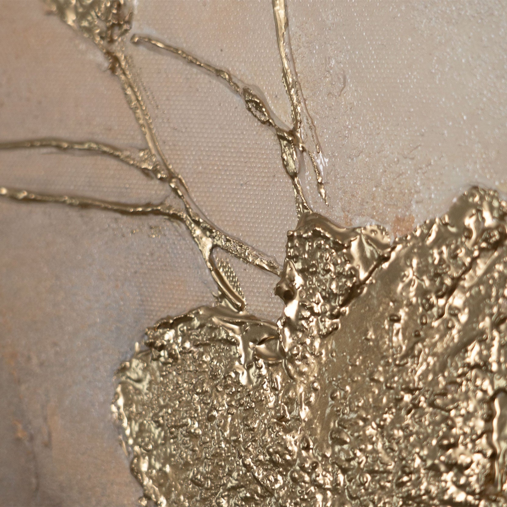 „Leuchten in den Wolken“ verbindet florale Eleganz mit abstrakter Tiefe. Goldene Blüten erheben sich aus einer wolkigen Komposition aus Grau-, Beige- und Cremetönen. Das feine Relief der Strukturen fängt das Licht auf besondere Weise ein und verleiht dem Bild einen luxuriösen Glanz.