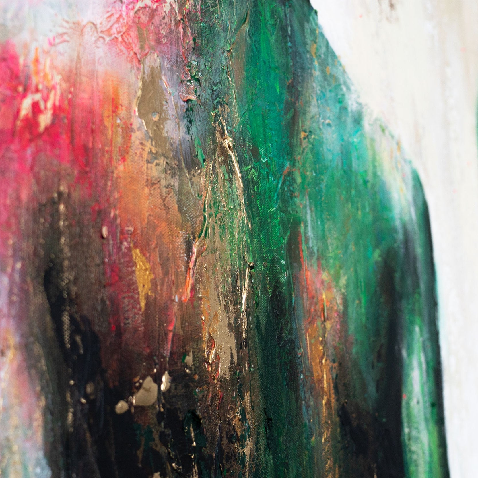 A piece of art that immediately catches the eye: Two elegant, abstract silhouettes, their heads transitioning into a fireworks display of vibrant red and pink flowers. The harmonious blend of rich greens, golden accents, and lively color splashes gives this canvas painting a special depth and energy.