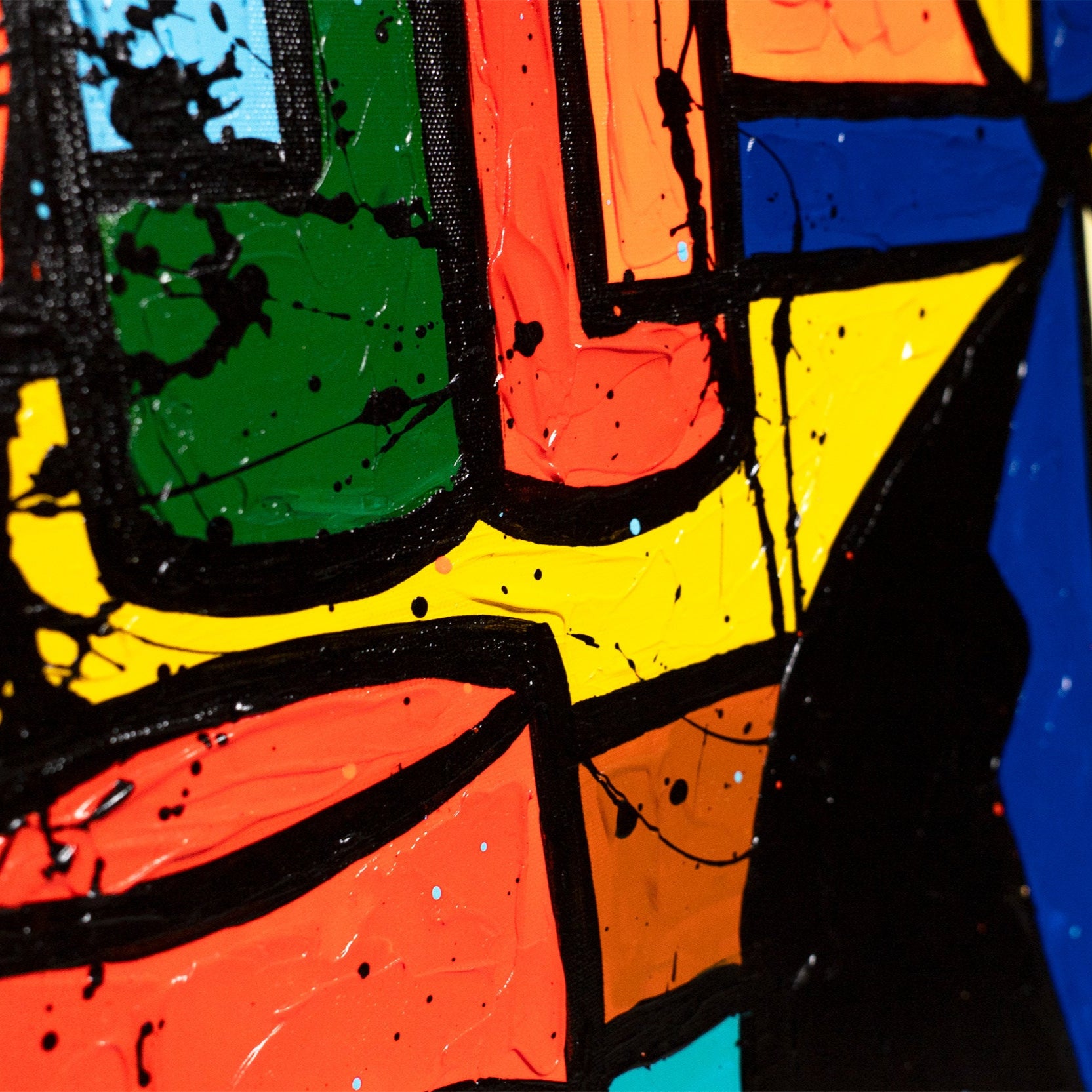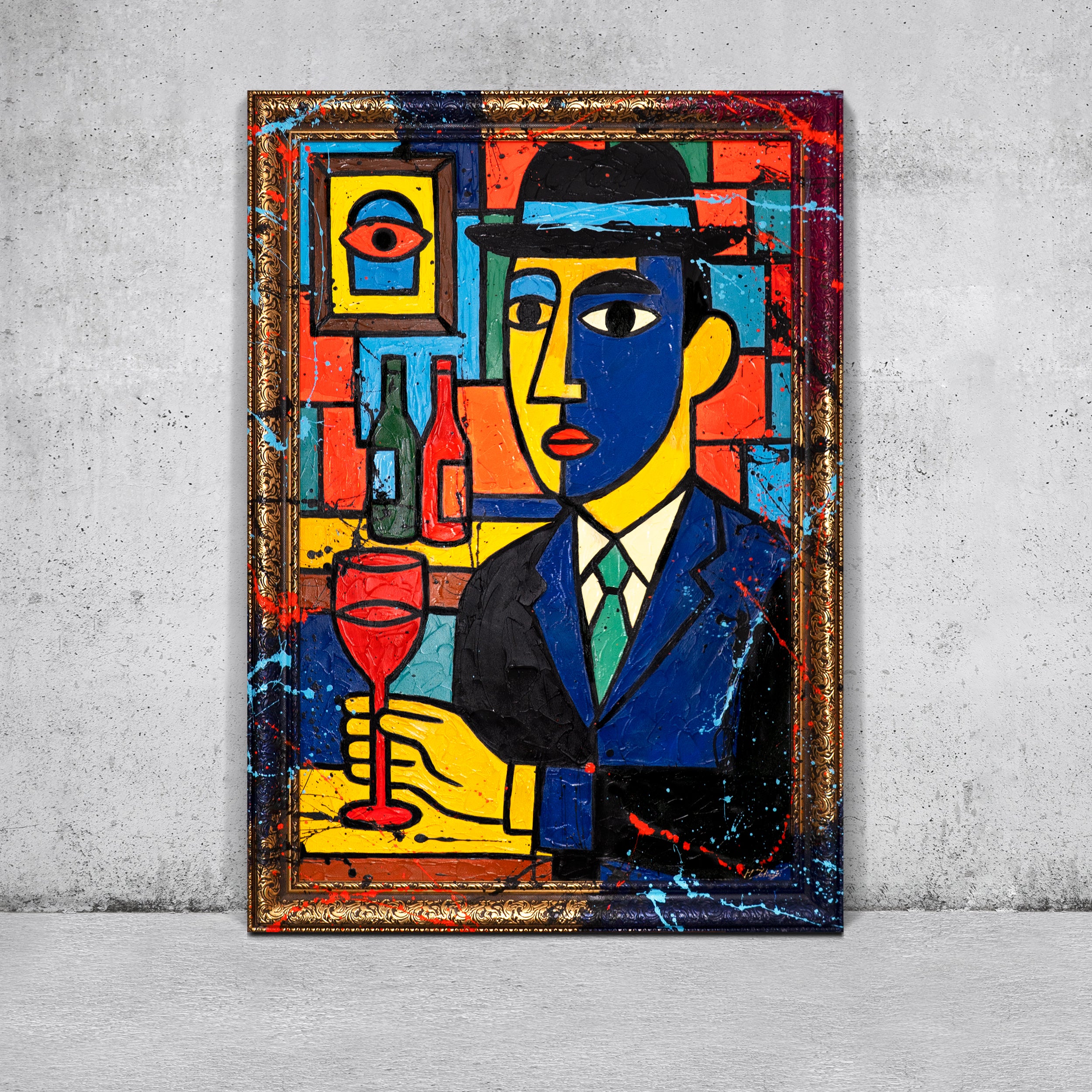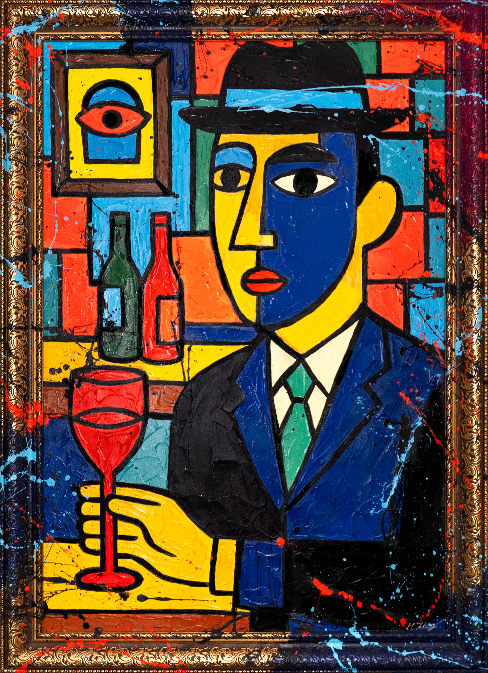 „Bar“ showcases the portrait of a man in cubist pop art style – in bold yellow, blue, and orange tones, complemented by green accents. He holds a glass of red wine, while bottles and a symbolic image with an eye in the background complete the artwork. The clean lines and contrasting color blocks make this painting a modern urban statement piece.