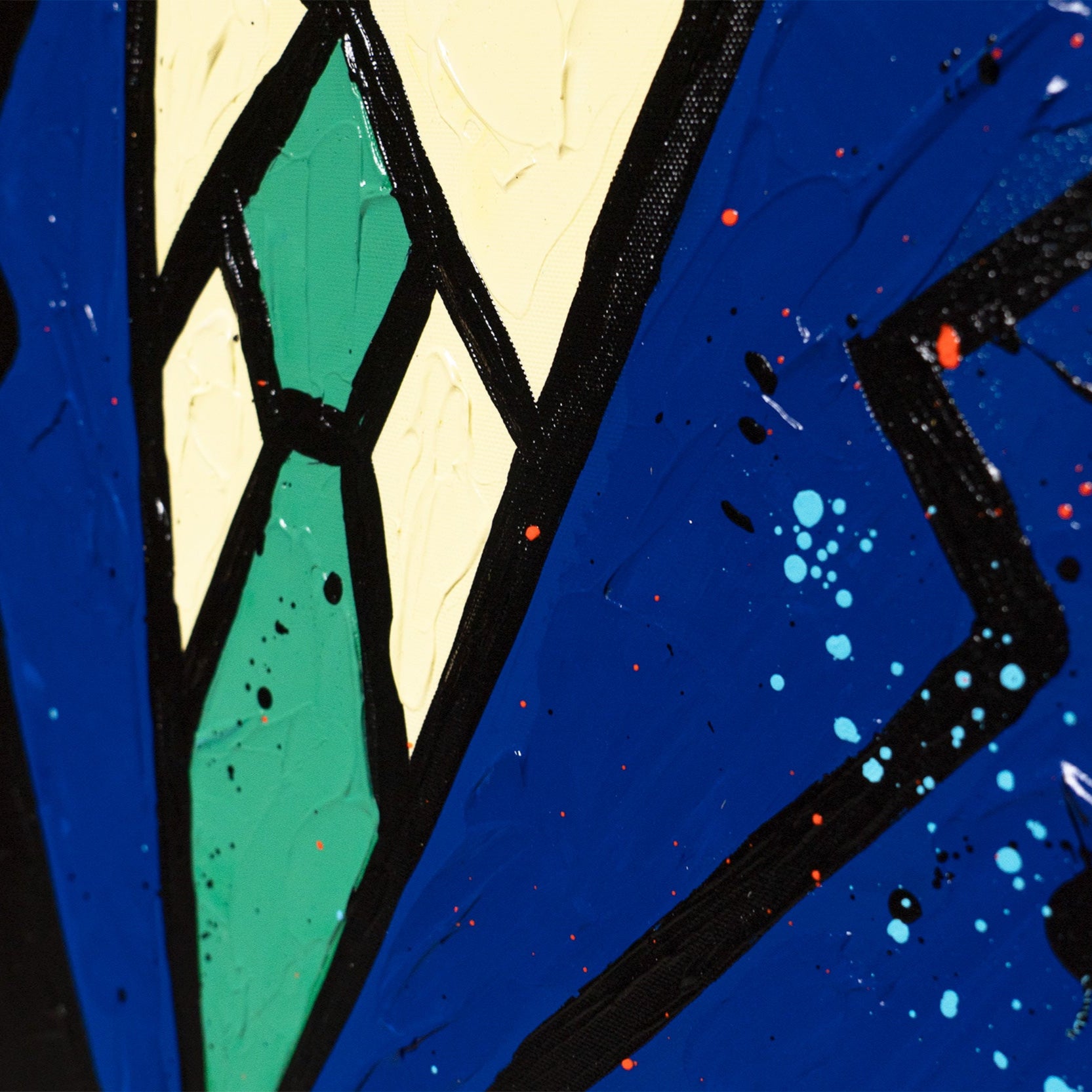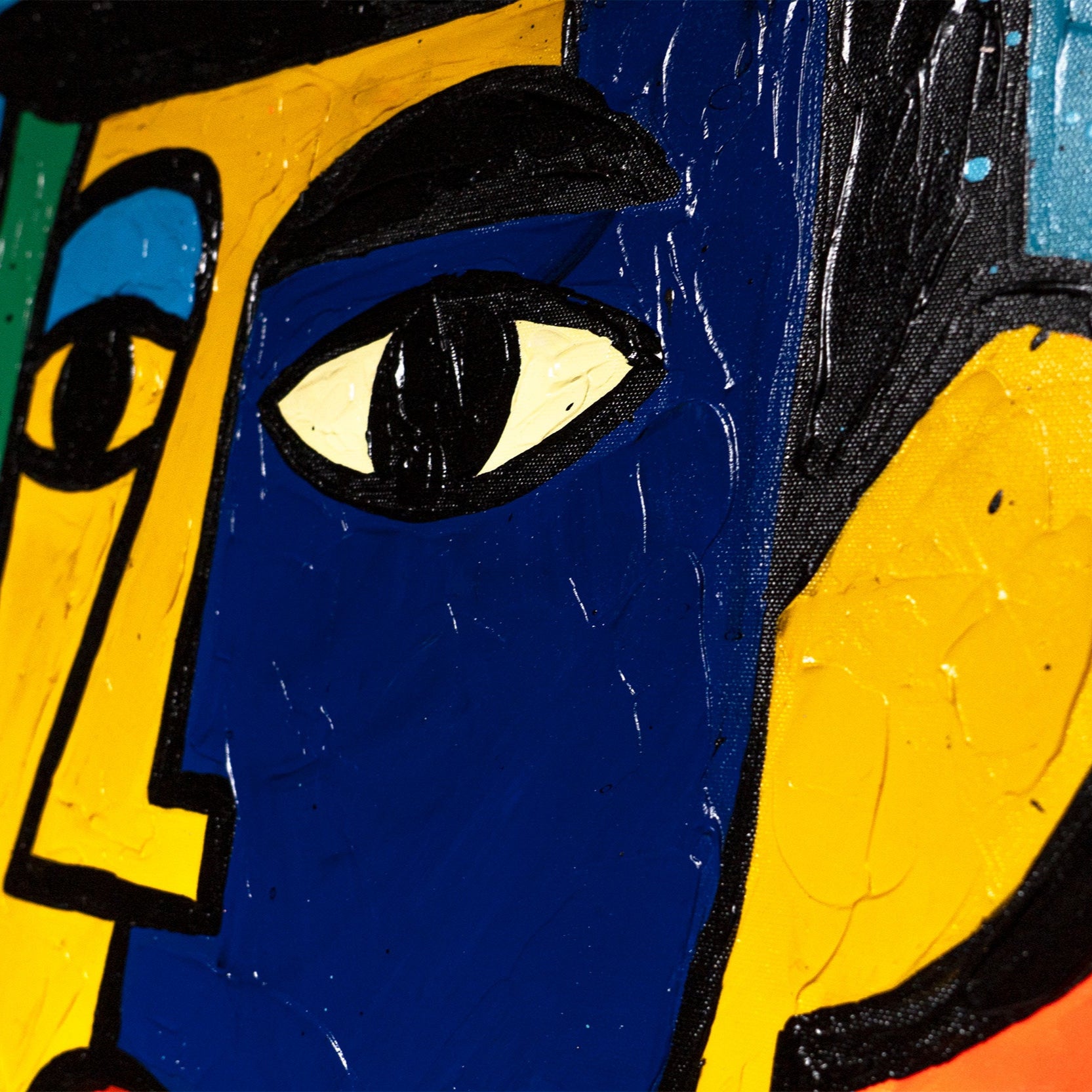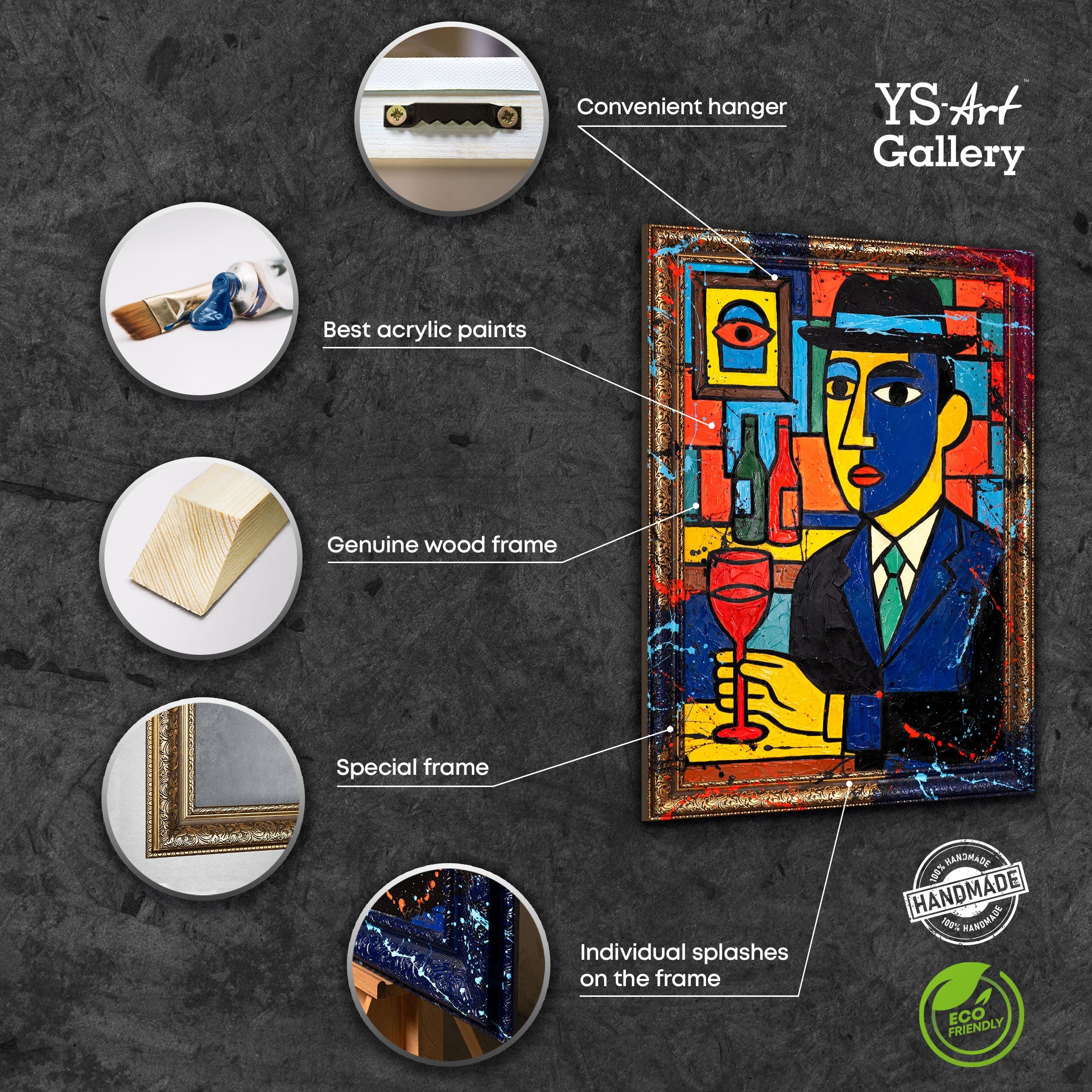 „Bar“ showcases the portrait of a man in cubist pop art style – in bold yellow, blue, and orange tones, complemented by green accents. He holds a glass of red wine, while bottles and a symbolic image with an eye in the background complete the artwork. The clean lines and contrasting color blocks make this painting a modern urban statement piece.