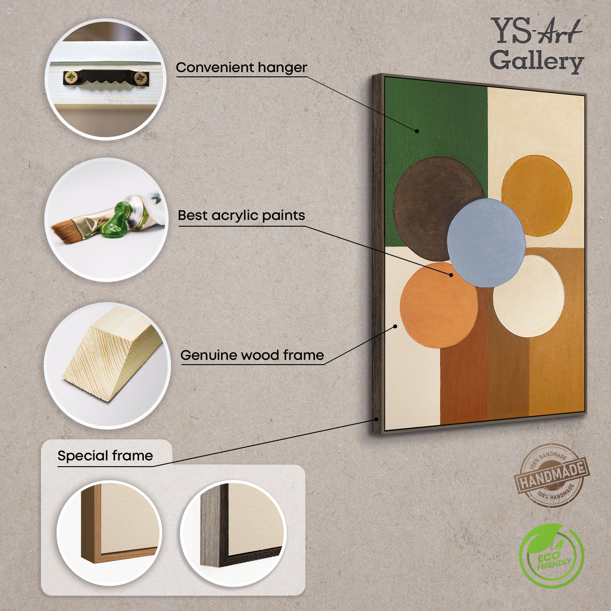 „Sphäre der Balance“ ist ein modernes, handgemaltes Acrylgemälde auf Leinwand, das mit seinen klaren geometrischen Formen und harmonischen Farbflächen fasziniert. Erdige Braun- und Beigetöne vereinen sich mit sanftem Grün, leuchtendem Orange und kühlem Blau zu einer Komposition, die Ruhe und Ausgeglichenheit ausstrahlt. Die strukturierte Oberfläche verleiht dem Werk Tiefe und ein einzigartiges haptisches Erlebnis.