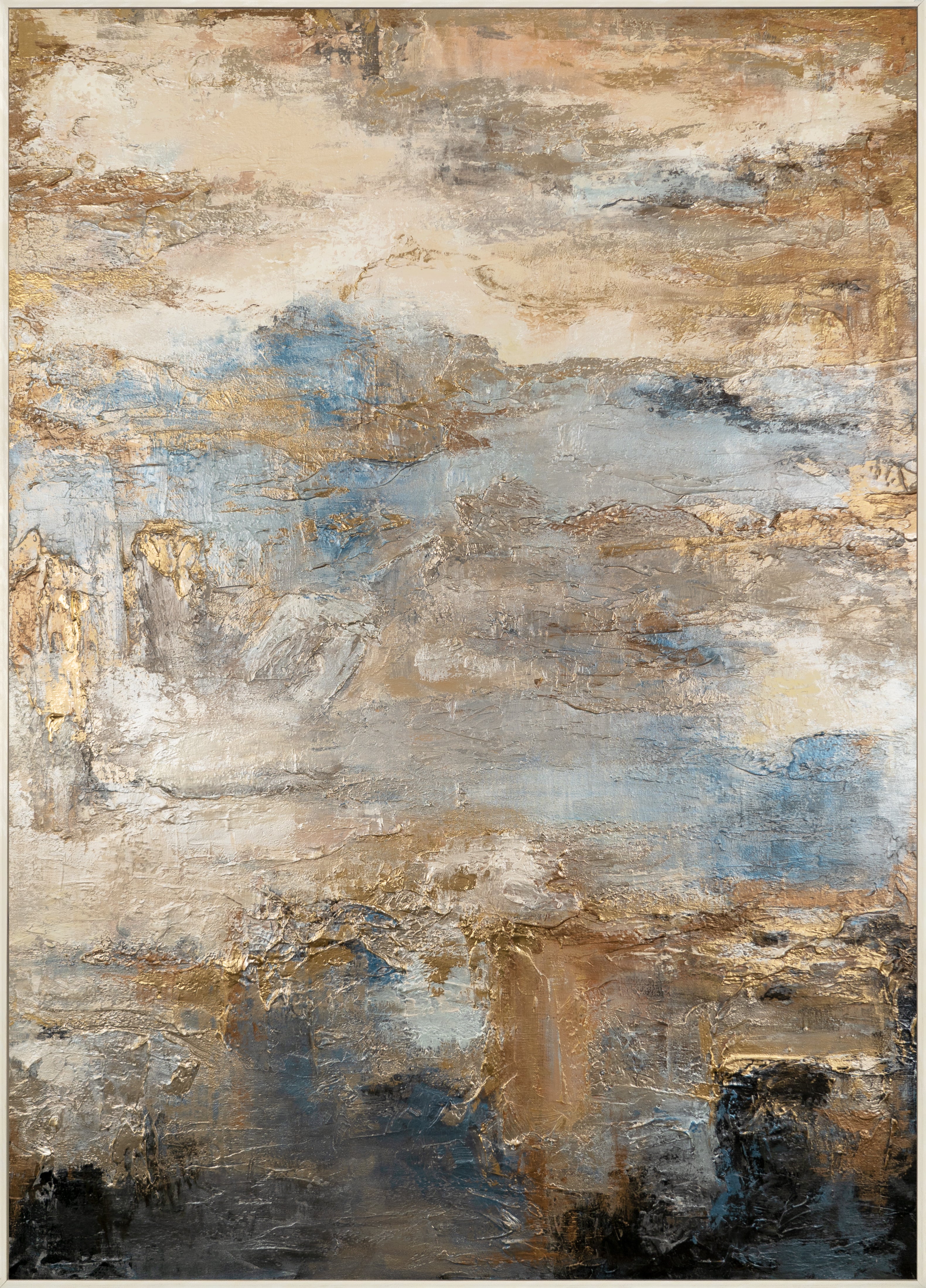 The hand-painted canvas „Shine & Elegance“ captivates with its harmonious composition of warm beige tones, radiant gold highlights, and subtle gray and blue nuances. The textured surface creates a fascinating three-dimensional effect and lively depth, while the gold accents add luxurious highlights, making the artwork a stylish focal point that exudes warmth and sophistication.