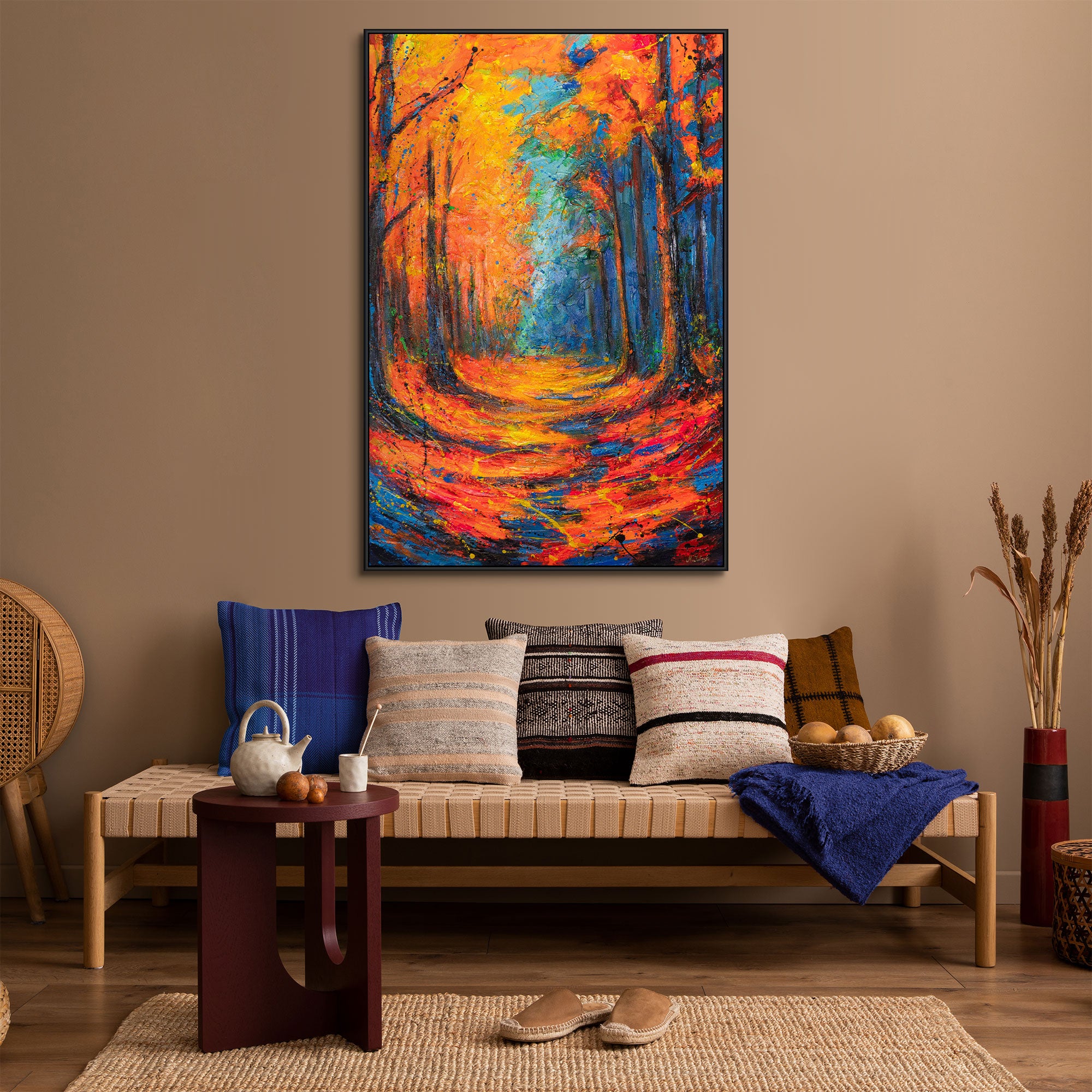 Canvas Wall Art with Frame „Glowing Paths in Autumn Forest“ – Hand-painted with Texture
