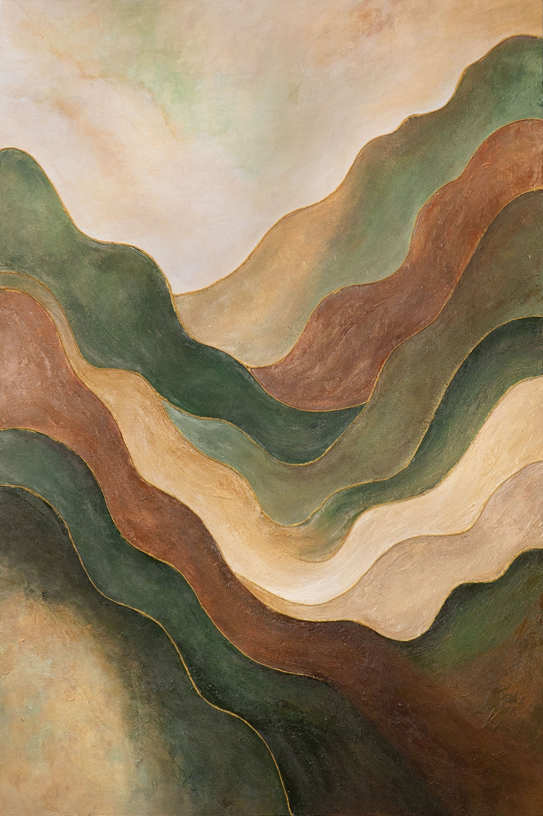 "Balance" is a hand-painted acrylic painting that captivates with its clear forms, lines, and a balanced color palette of Beige, Green, Rust Red, and Black. The geometric composition exudes calm and stability, while the textured surface adds depth and expression to the piece.