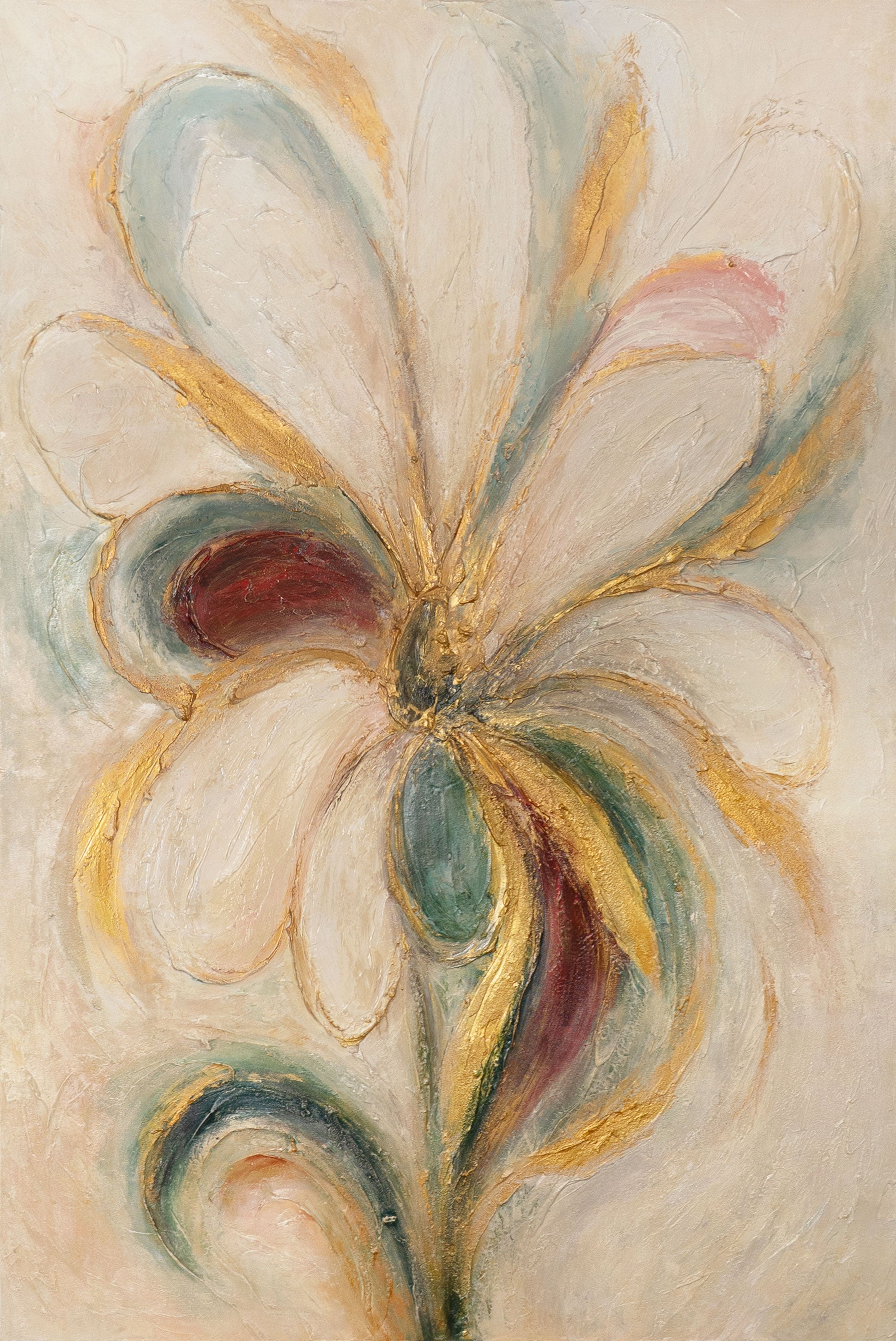 "Floral Energy" is a hand-painted acrylic painting on canvas that unfolds floral dynamism with its intense color power and flowing lines. Vibrant accents in Gold, Green, and Red meet soft Cream and Beige tones, creating a harmonious yet lively image. The textured surface adds depth and movement, evoking a stylized flower in the wind.
