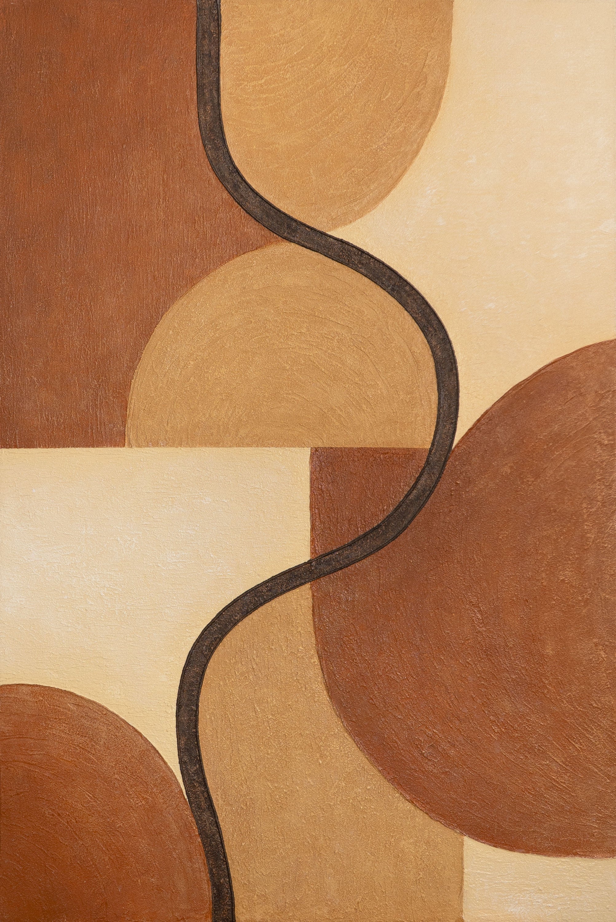 „Verflechtung der Formen“ ist ein handgemaltes Acrylgemälde, das durch seine harmonische Verbindung aus Linien und Flächen besticht. Die Komposition in warmen Braun-, Beige- und Ockertönen erzeugt eine natürliche Tiefe und ein Gefühl von Bewegung. Die reliefartige Struktur bringt Dynamik in die geometrischen Formen und verleiht dem Werk eine moderne, taktile Ausstrahlung.