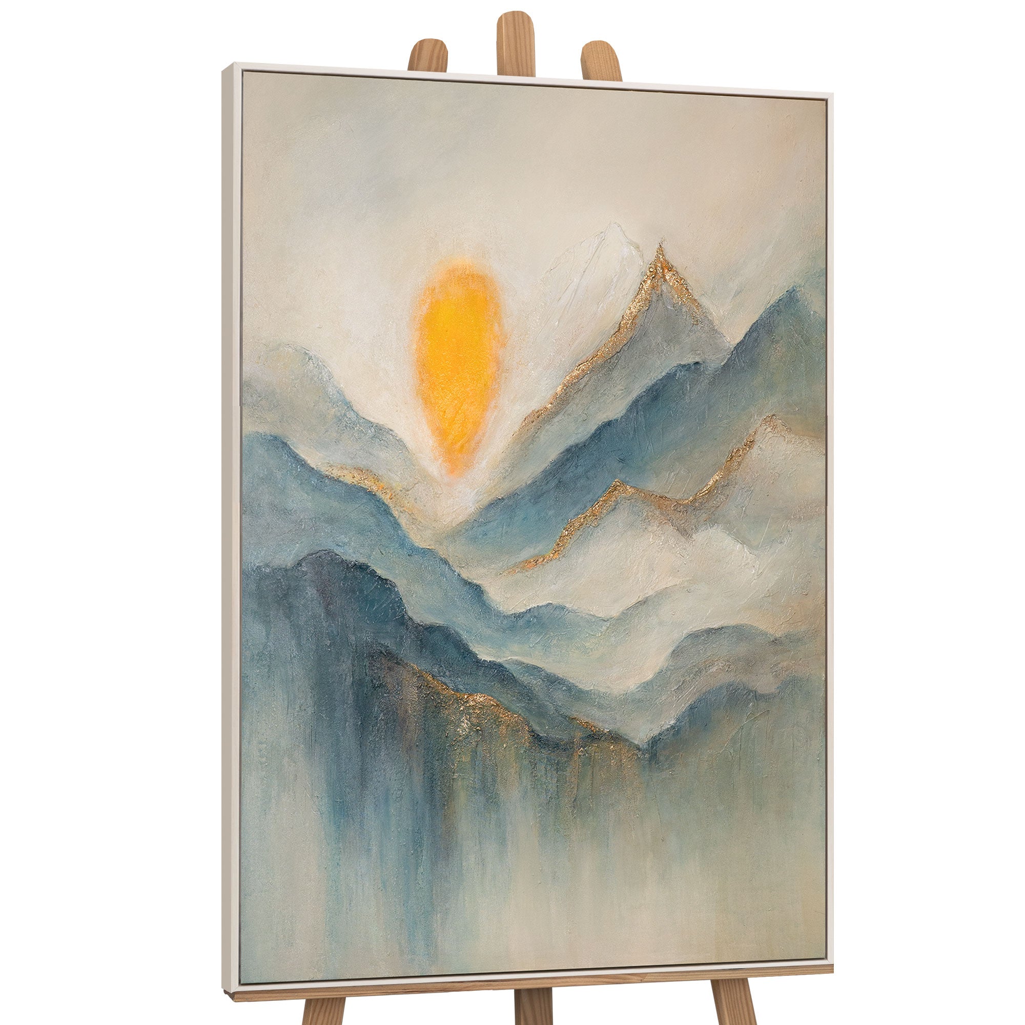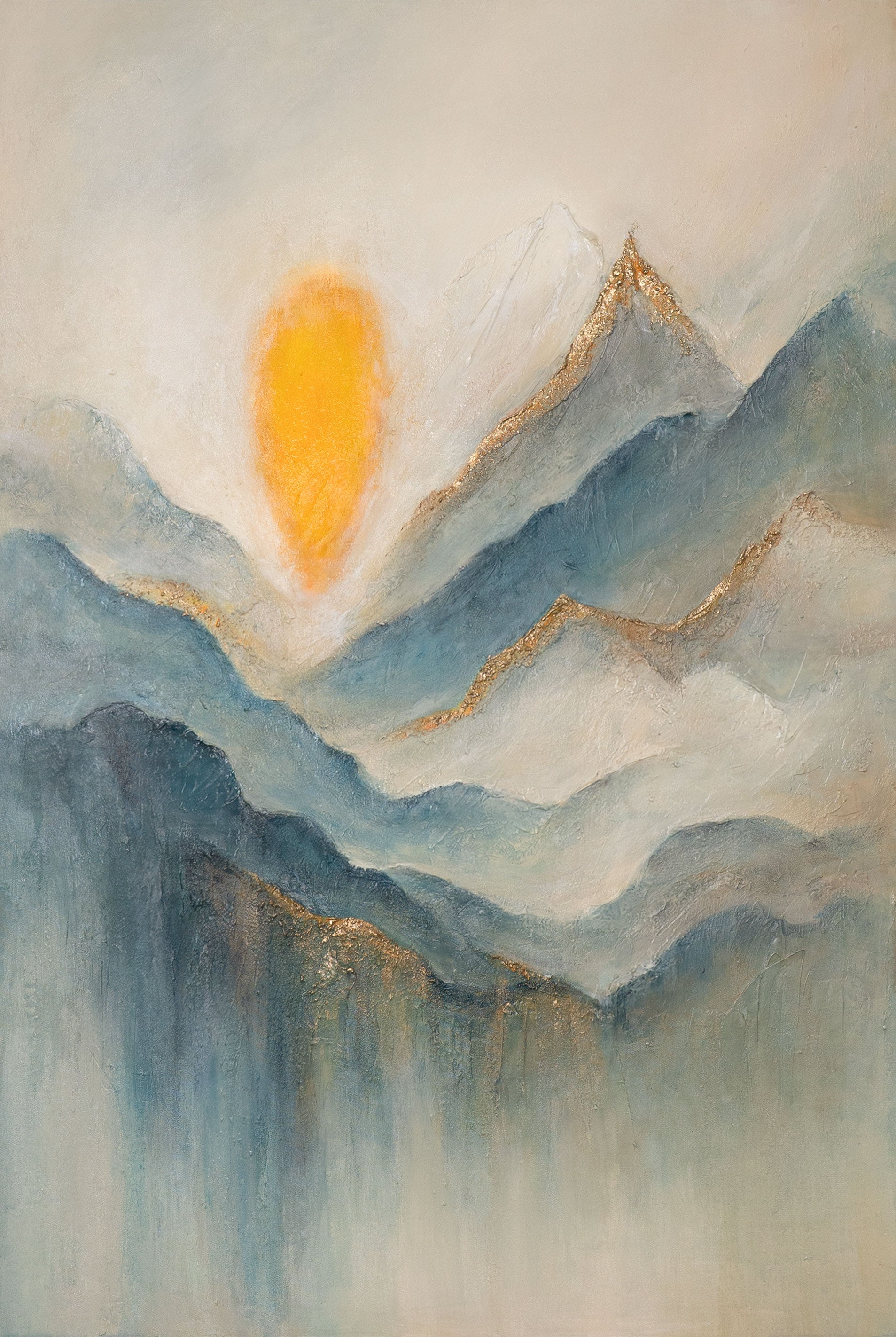 "Dawn in the Clouds" is a captivating, hand-painted acrylic painting that delights with its combination of radiant Gold and soft Blue tones. The dynamic brushstrokes give the mountains and clouds a unique depth, while the golden accents emphasize the sunrise impressively. The textured surface enhances the liveliness of the motif, making the piece a captivating focal point with an expressive aura.