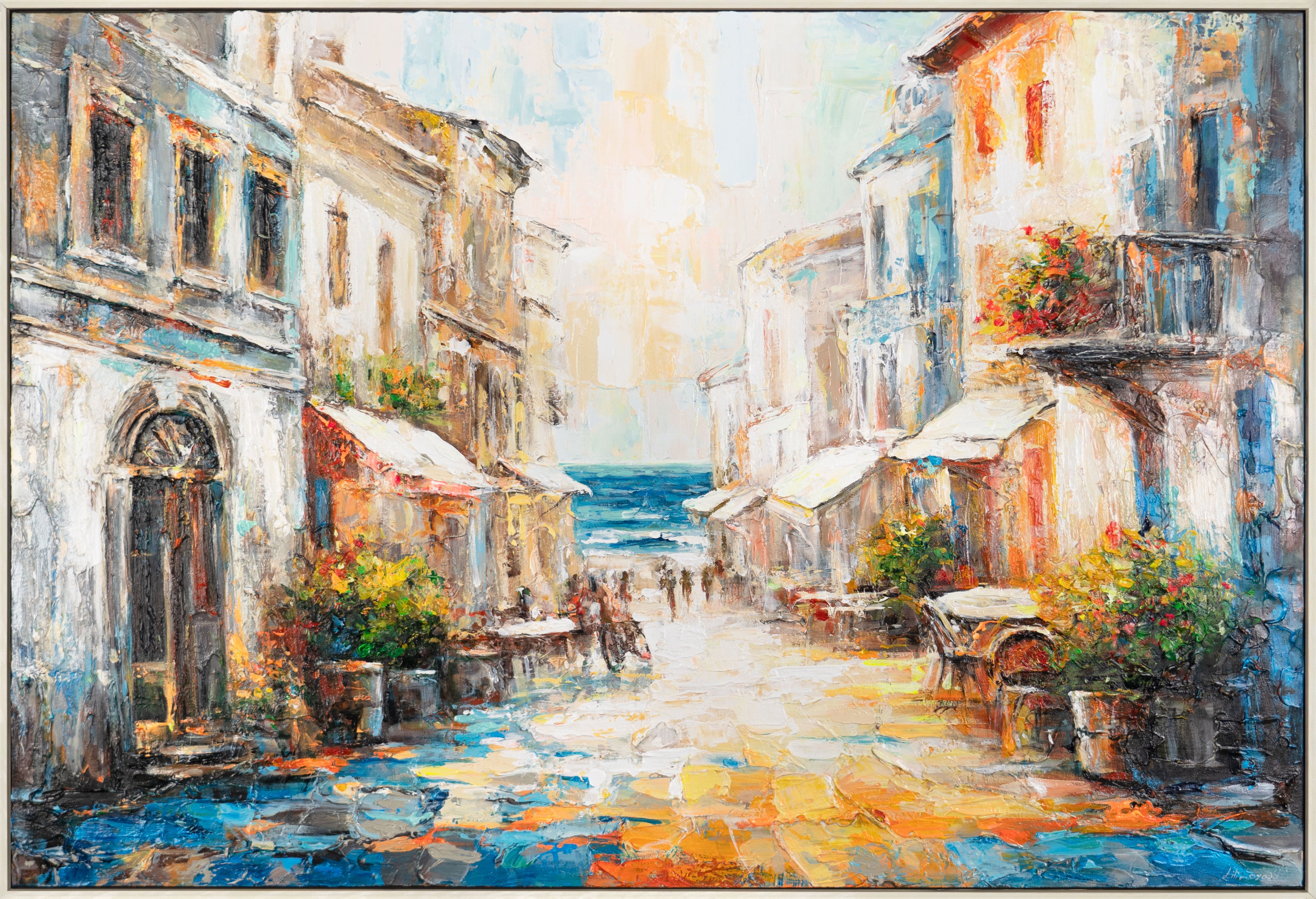 • "Warm Breeze" – Charming Street Scene with Sea View, Hand-Painted Acrylic on Canvas