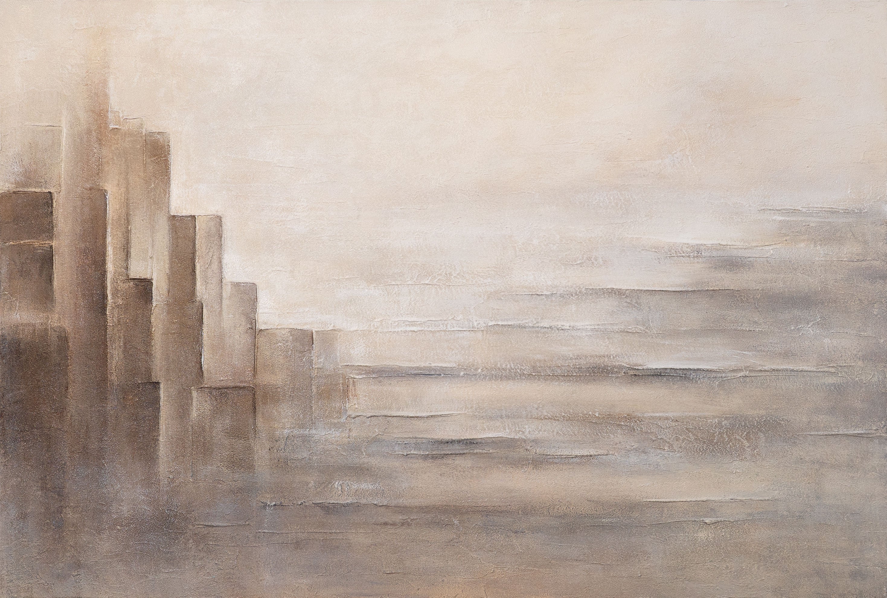 The hand-painted canvas painting "Borders of Illusion" plays with clear structures and soft transitions. Rectangular shapes rise like steps, while gentle Beige and Brown tones merge into expansive areas. The composition conveys the impression of an urban landscape fading into the distance – a blend of architecture and illusion.