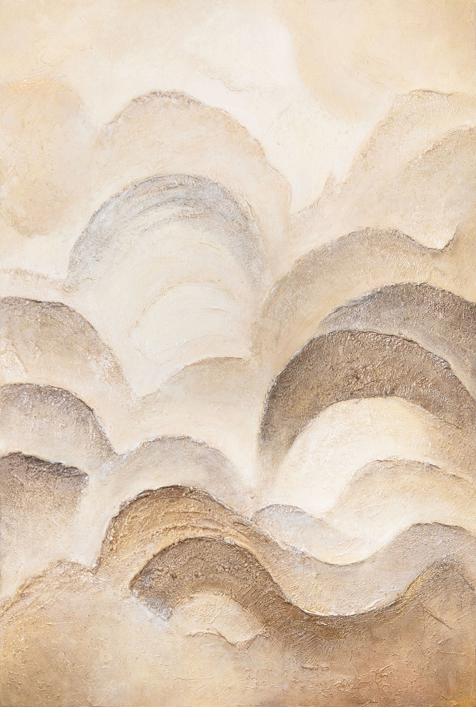 Bring natural tranquility into your home with this hand-painted abstract wall art. The gentle layers in Beige, Brown, and Cream tones resemble the contours of mountains or waves, creating a warm, harmonious atmosphere.
