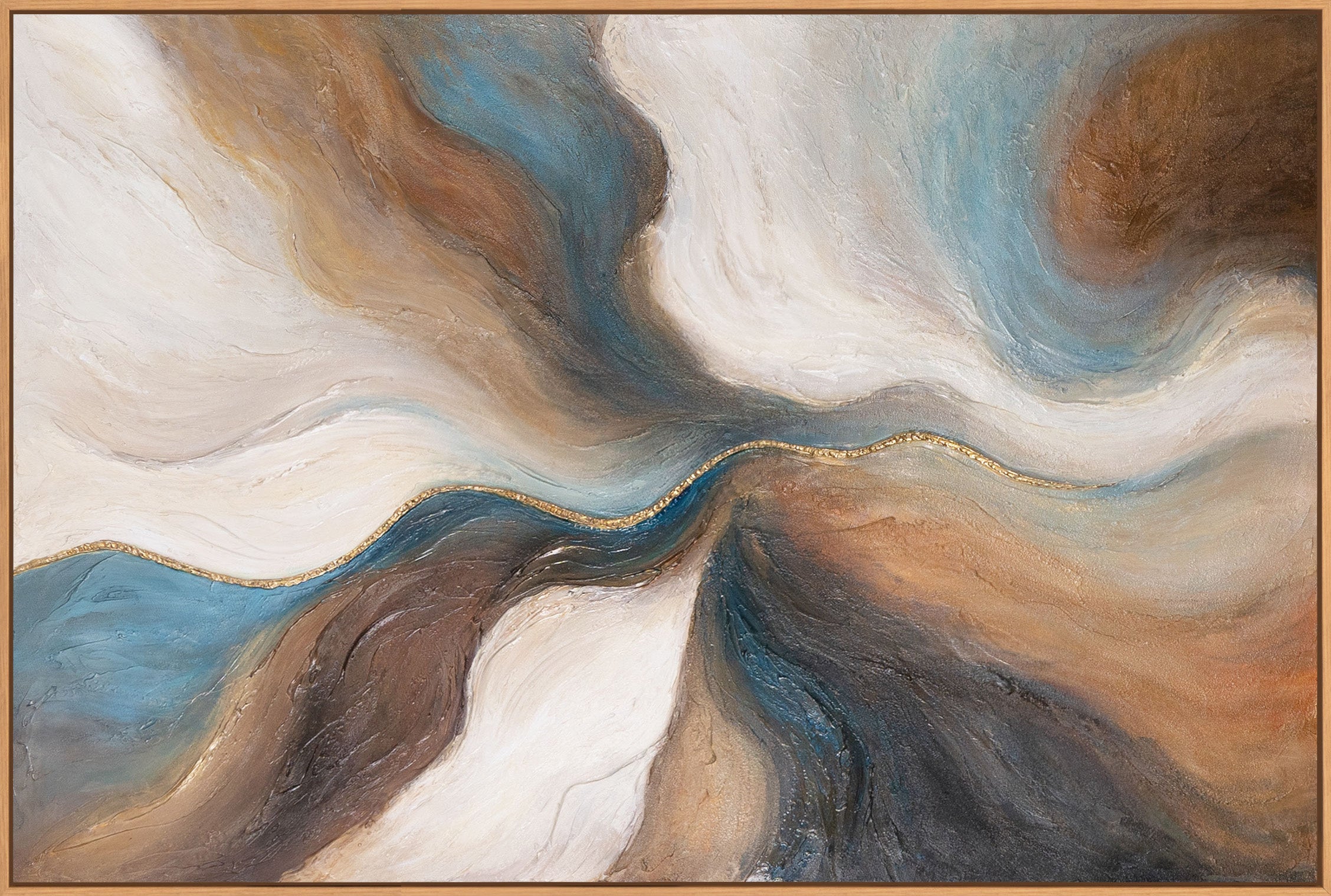 "Passage of Time" showcases a fluid interplay of warm earth tones, delicate cream areas, and cool blue accents. The organic movements evoke waves, sediments, or landscapes that change over time. A fine golden line runs through the painting, lending the work elegance and subtle refinement. The impasto texture gives the surface a vibrant appearance and adds depth to any room.