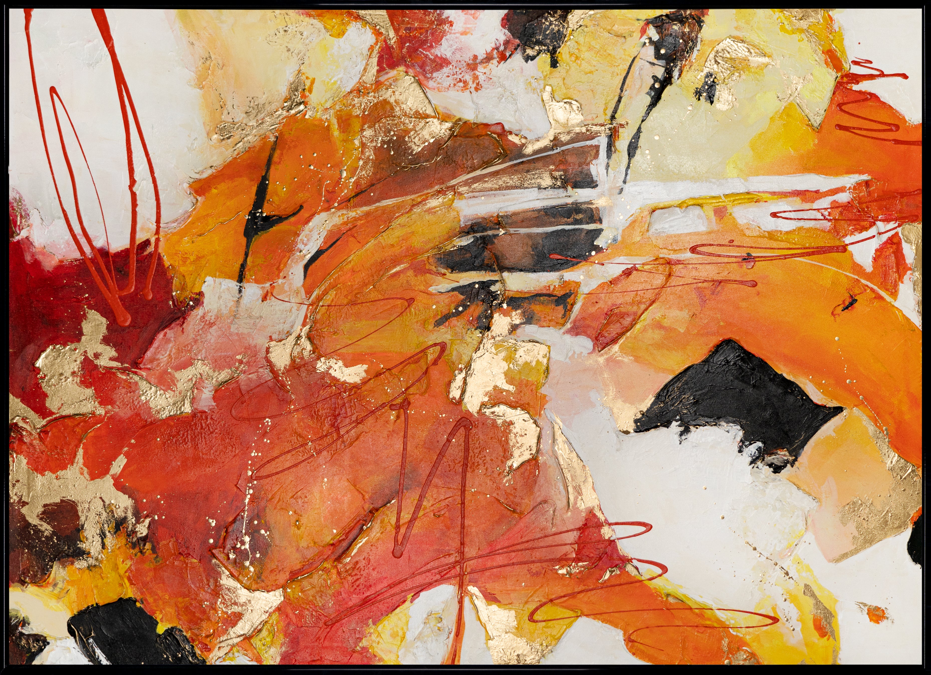 • Abstraktes Kunstwerk mit schwarzem Rahmen, lebendigen Rot-, Gelb- und Goldtönen, handgemaltes Ölgemälde, modernes abstraktes Kunstwerk für Wohnzimmer oder Büro