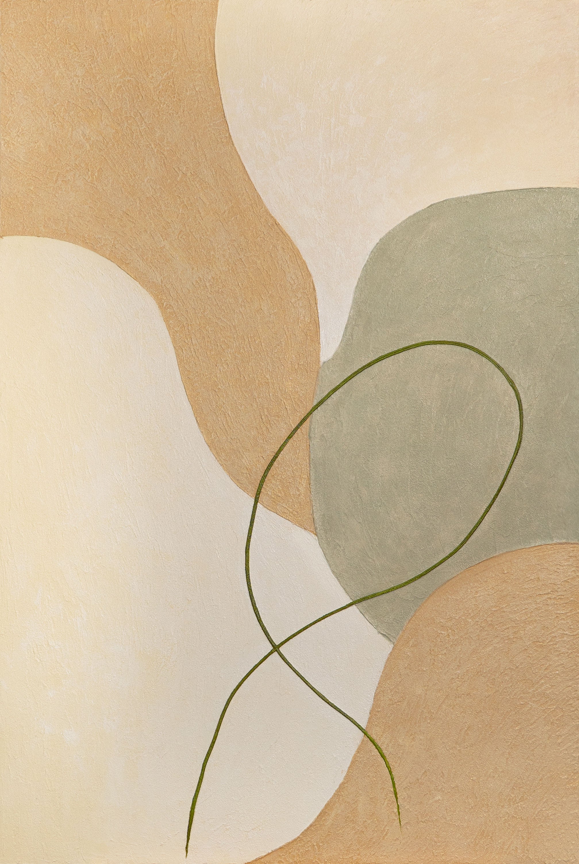 „Verflechtung“ ist ein handgemaltes Acrylbild, das durch seine sanfte Linienführung und harmonische Farbkomposition besticht. Zarte Beigetöne, cremefarbene Flächen und ein feiner grüner Schwung schaffen eine ruhige, organische Bewegung, die sowohl elegant als auch modern wirkt.