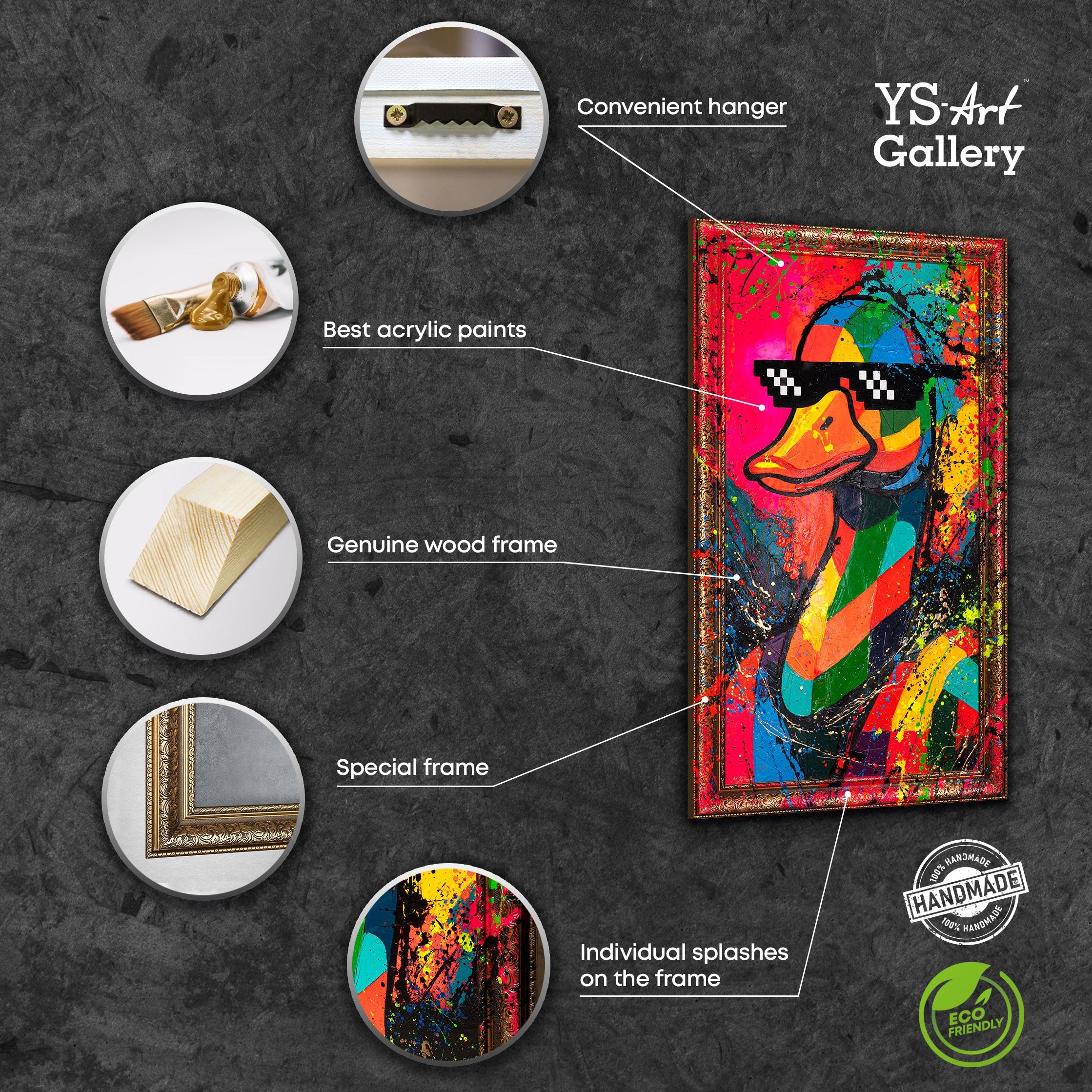 This colorful canvas painting is a true statement: a Pop-Art duck with iconic sunglasses in vibrant colors, surrounded by energetic splashes. Every brushstroke is hand-painted, making this work a one-of-a-kind piece – full of humor, boldness, and urban lifestyle.