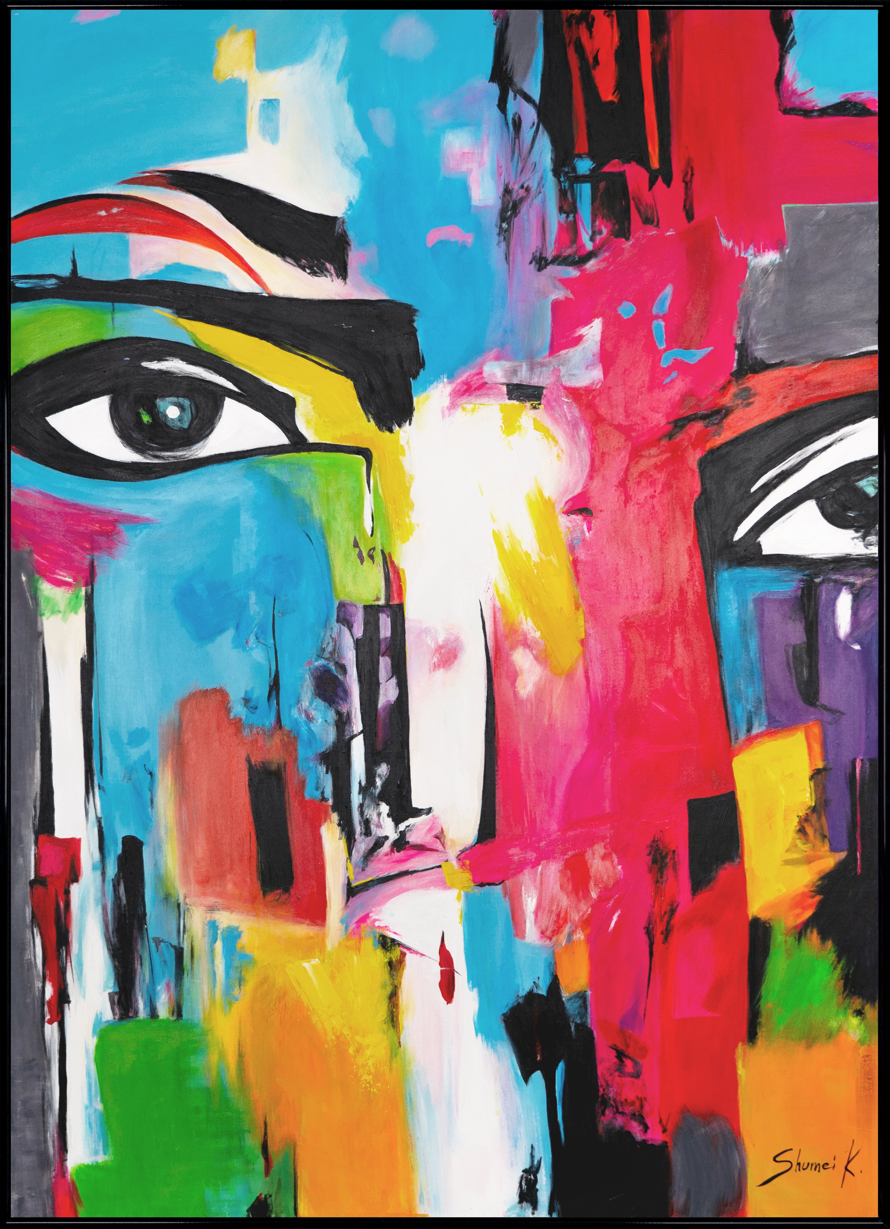 This modern, abstract portrait was created entirely by hand. The vibrant colors and bold lines give the face an intense expressiveness that will enrich any room. The frame is customizable so that it fits perfectly into your interior design concept. With our free shipping, you will receive this work of art in just 1-3 days and can display it in your home immediately.