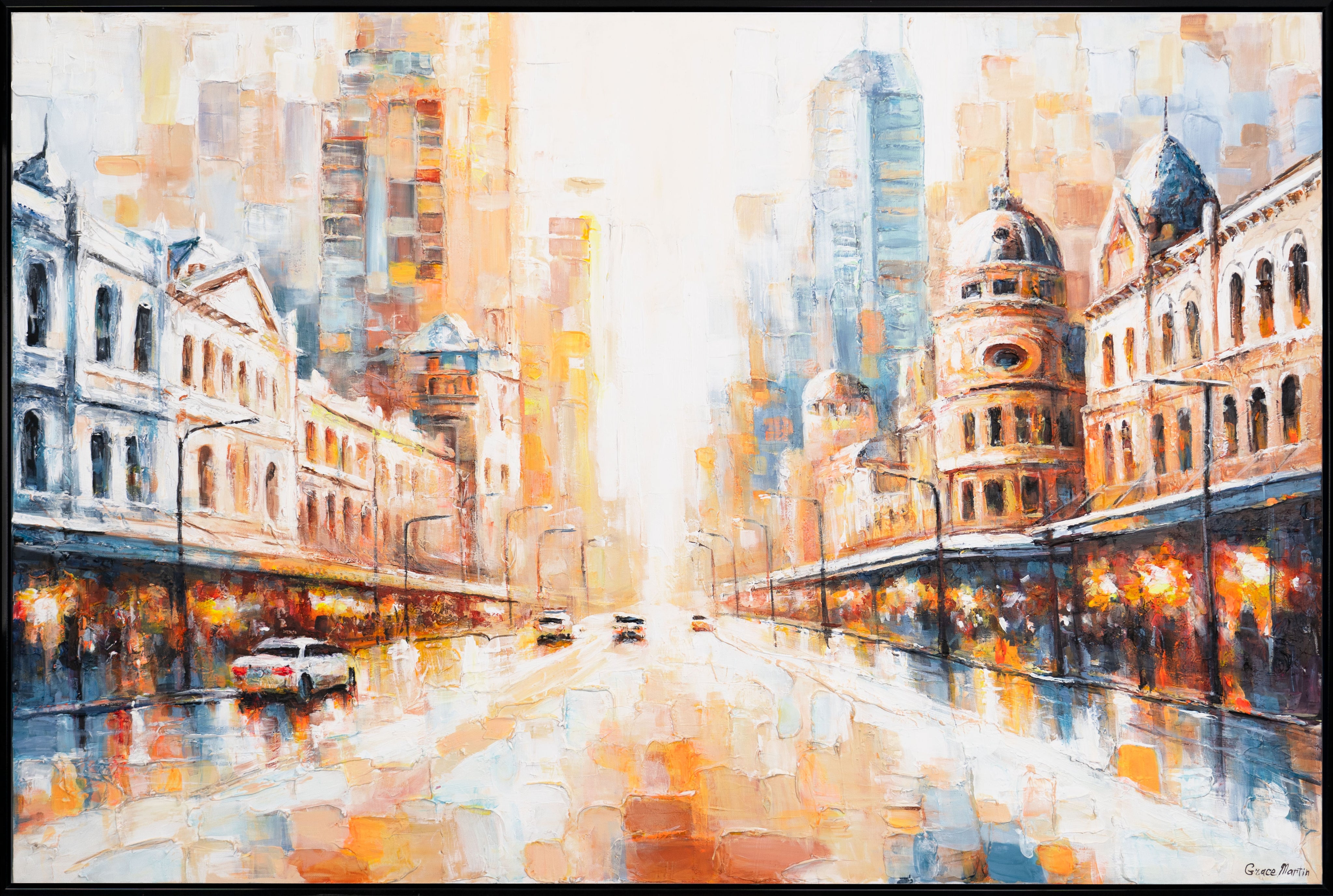 The hand-painted canvas „Space and Rhythm“ captures the vibrant energy of an urban cityscape. Bold brushstrokes and a textured surface create a dynamic composition of light, color, and architectural forms. Warm tones and abstract representation give the artwork a modern yet inviting character.