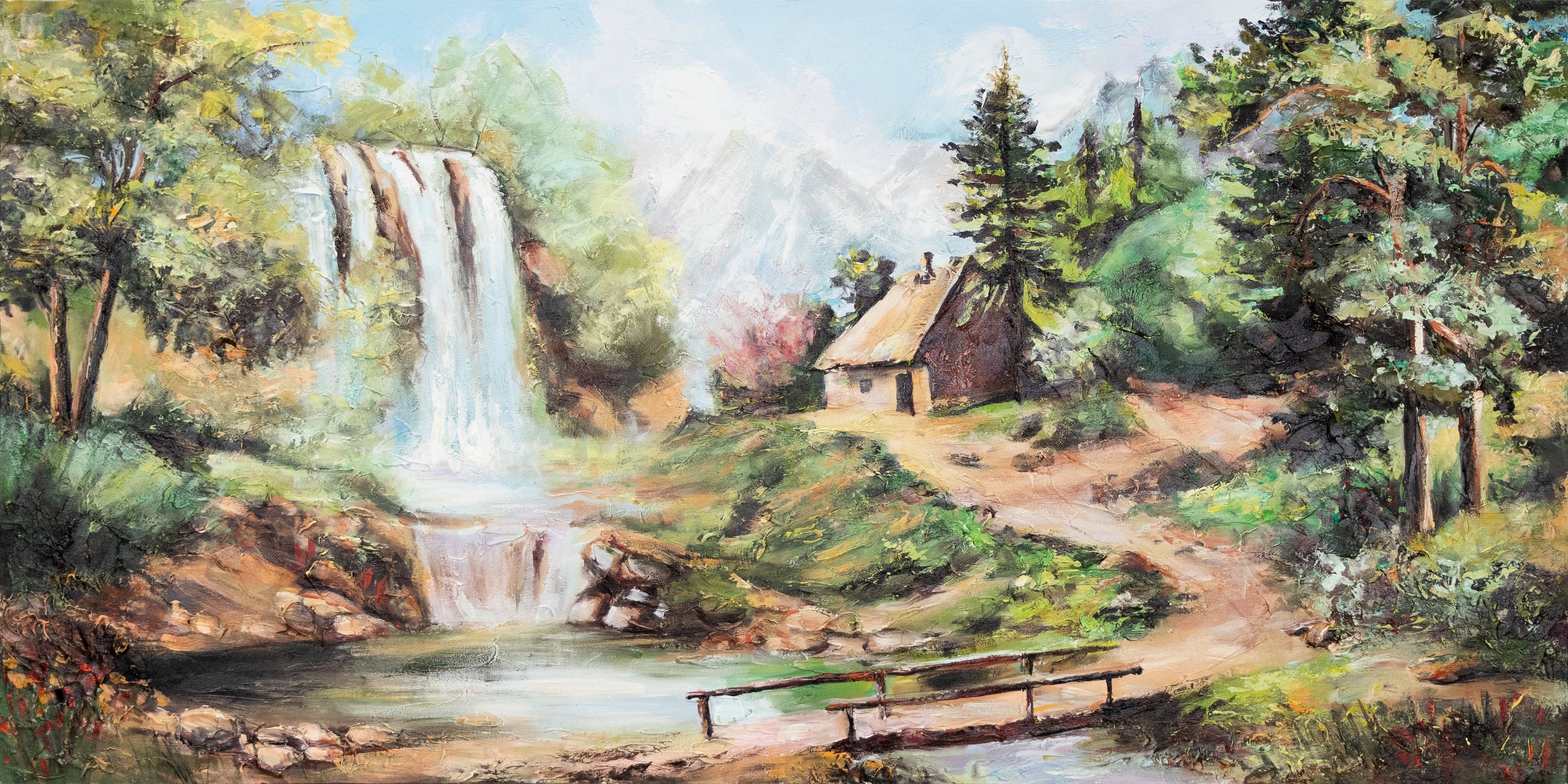 Immerse yourself in the idyllic world of this hand-painted landscape painting. The vivid colors and precise brushstrokes create a realistic scene with a picturesque waterfall and a cozy country house. This work of art is completely handmade and a unique one-of-a-kind. We offer free delivery directly to your home.