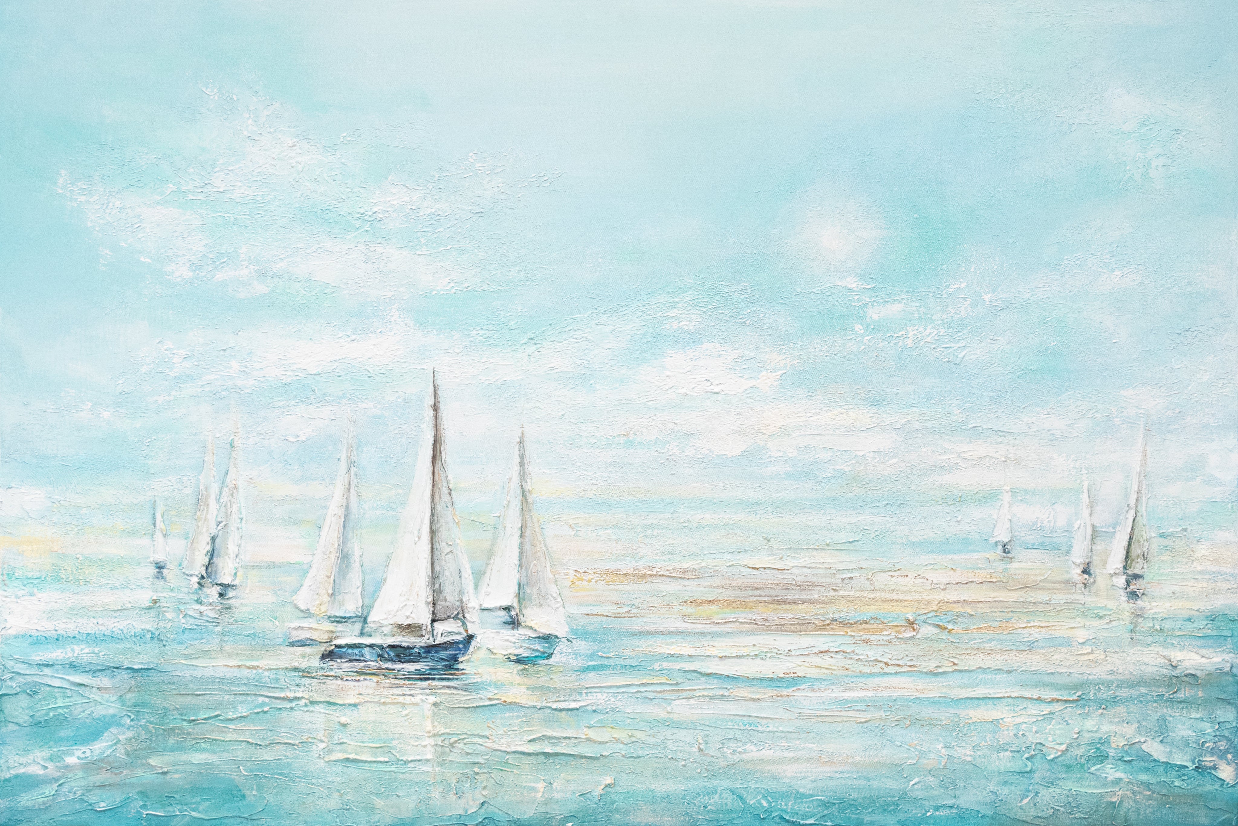 Immerse yourself in the soothing world of the sea with this hand-painted painting. It depicts a tranquil sailing scene in soft, harmonious colors that create a relaxed and peaceful atmosphere in any room. This work of art is completely handmade and carefully presented in a matching frame that perfectly complements the overall look.