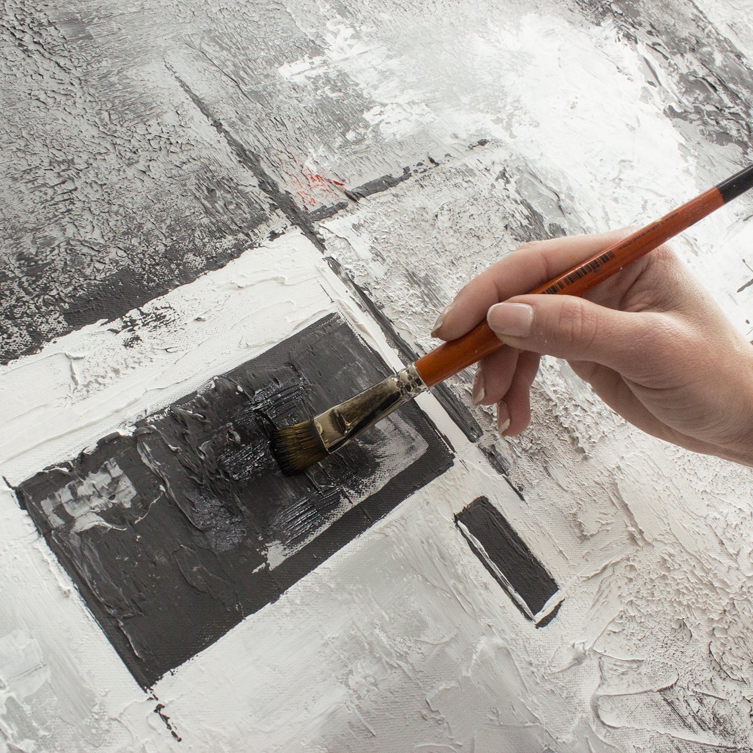 Dynamic, angular, uncompromising – the abstract canvas painting „Courage” is a visual statement. The composition of black, gray, and white is broken up by vibrant red lines and splashes of color, dancing across the canvas like emotional outbursts. Geometric shapes meet expressive spontaneity, fine lines contrast with rough texture – a high-contrast play that radiates tension and strength.