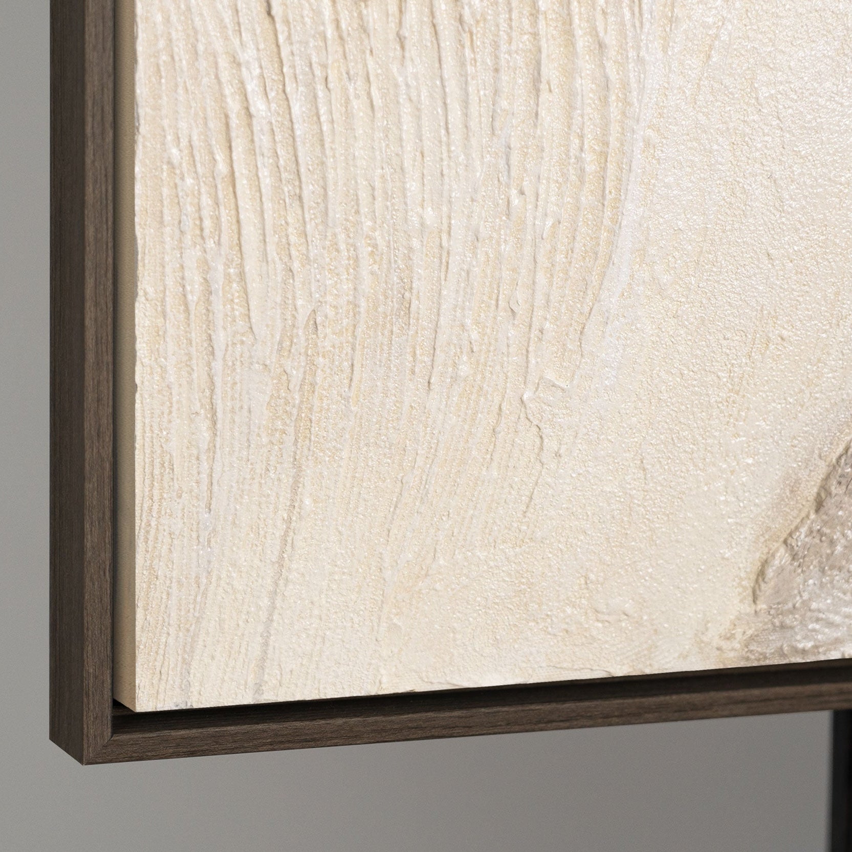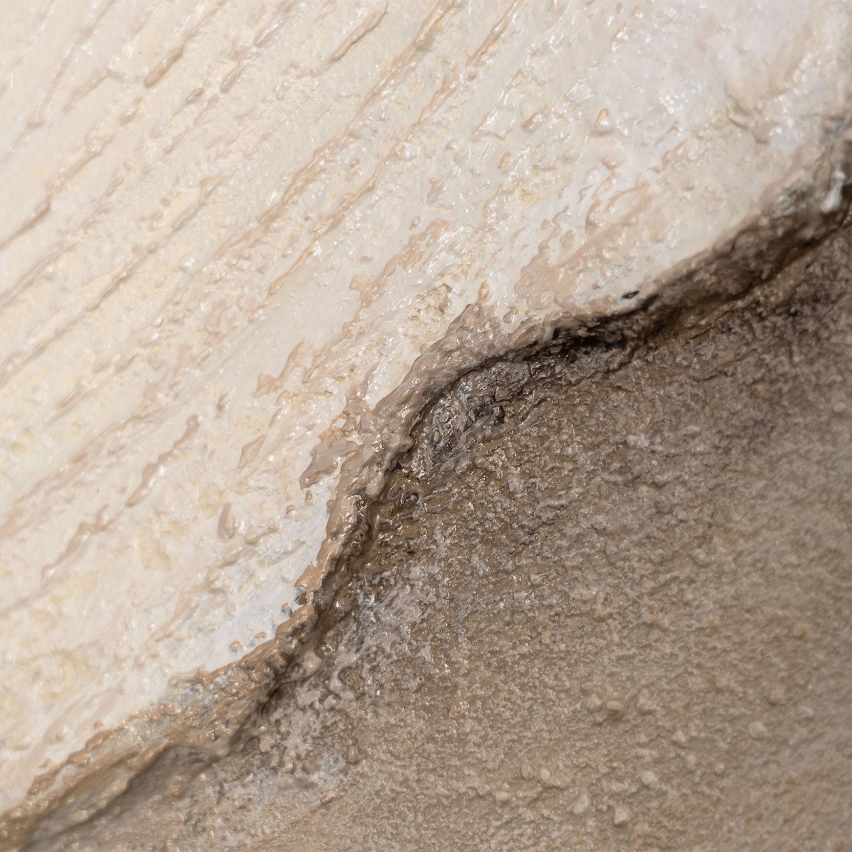 • Detail eines abstrakten Leinwandbildes mit schichtartiger Struktur in Beige