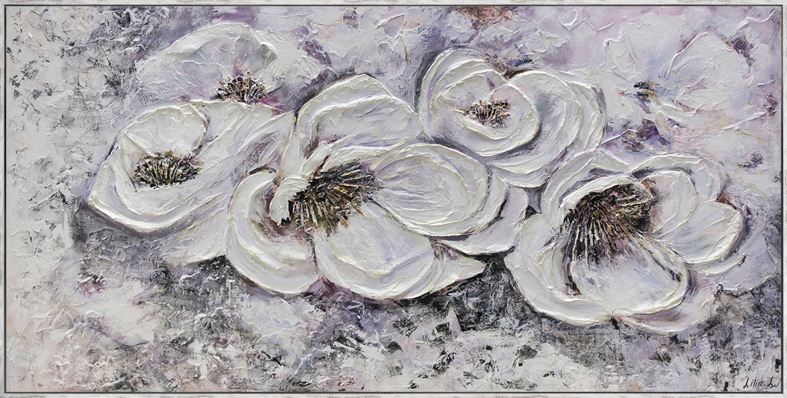 This beautiful acrylic painting features a striking depiction of white blossoms in full bloom. The vibrant textures and detailed brushstrokes lend the flowers a special depth and vibrancy. The artwork is ideal as a highlight for any modern interior, bringing an elegant, natural atmosphere to your home.