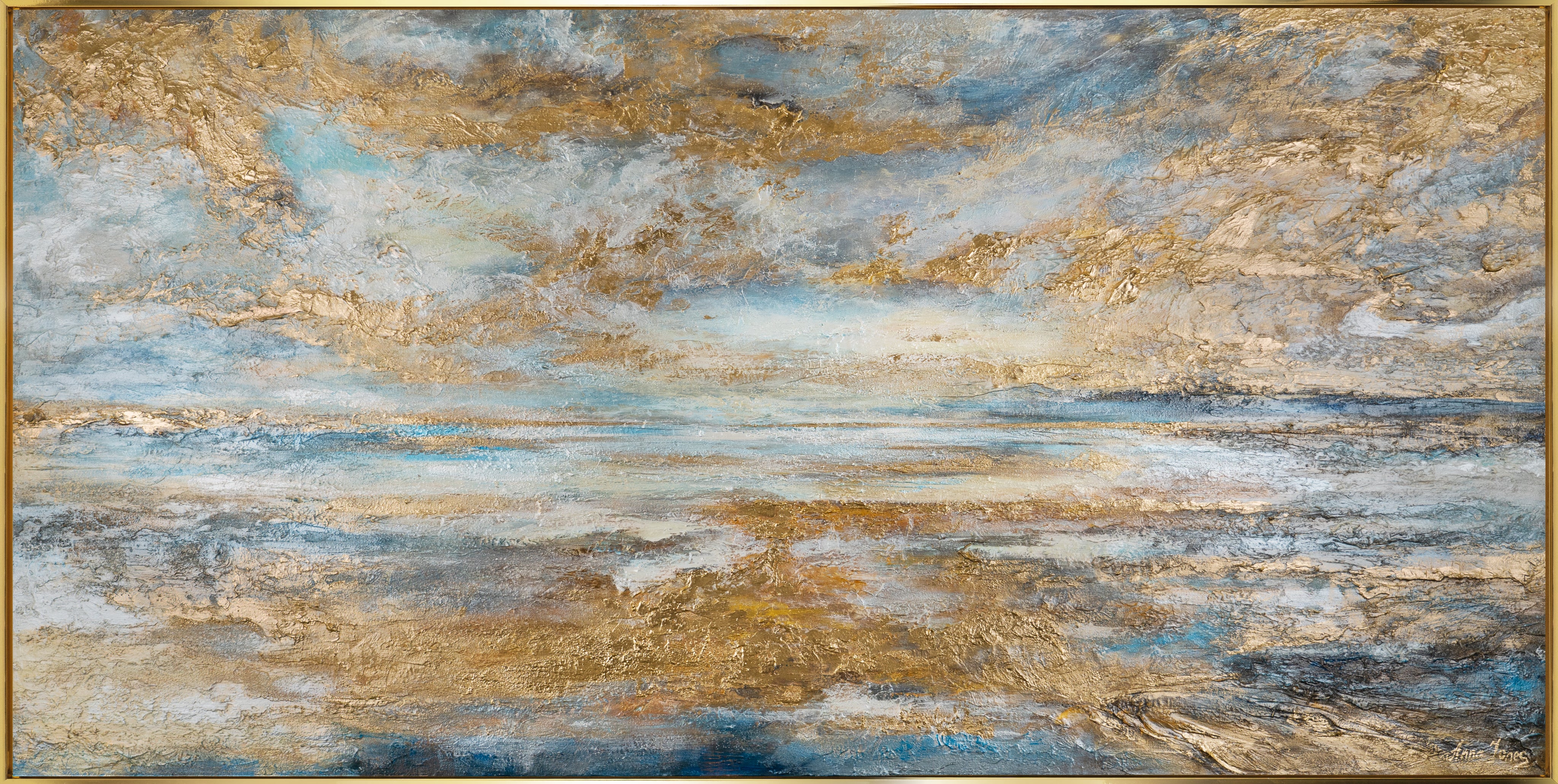 The hand-painted canvas „Golden Bay“ features a captivating composition of soft blues and warm gold accents, creating a serene maritime atmosphere. The textured surface with relief-like gold highlights gives the artwork a unique sense of depth, drawing the viewer into a tranquil bay. Its abstract design allows for personal interpretation while adding an elegant touch to any room.