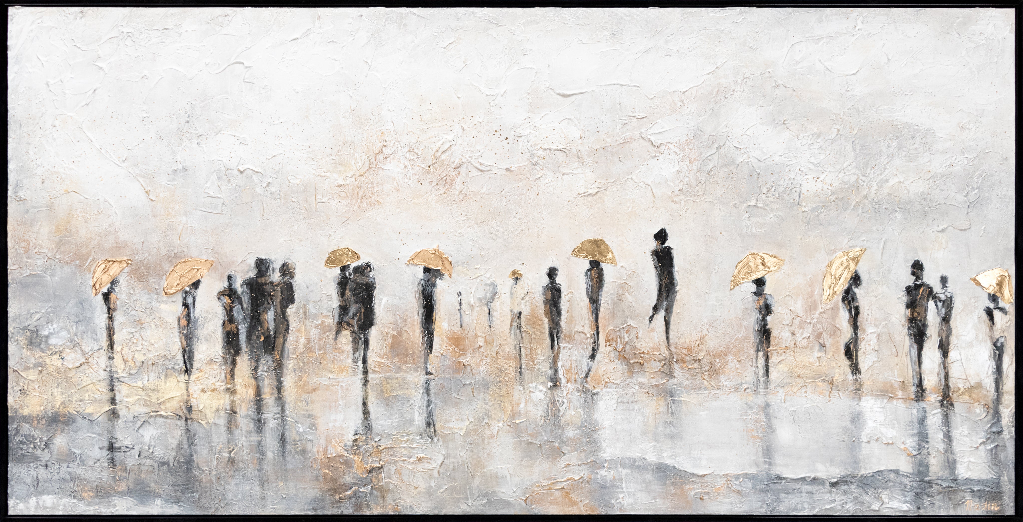Abstract Figure Painting – Hand-Painted People with Golden Umbrellas on Canvas