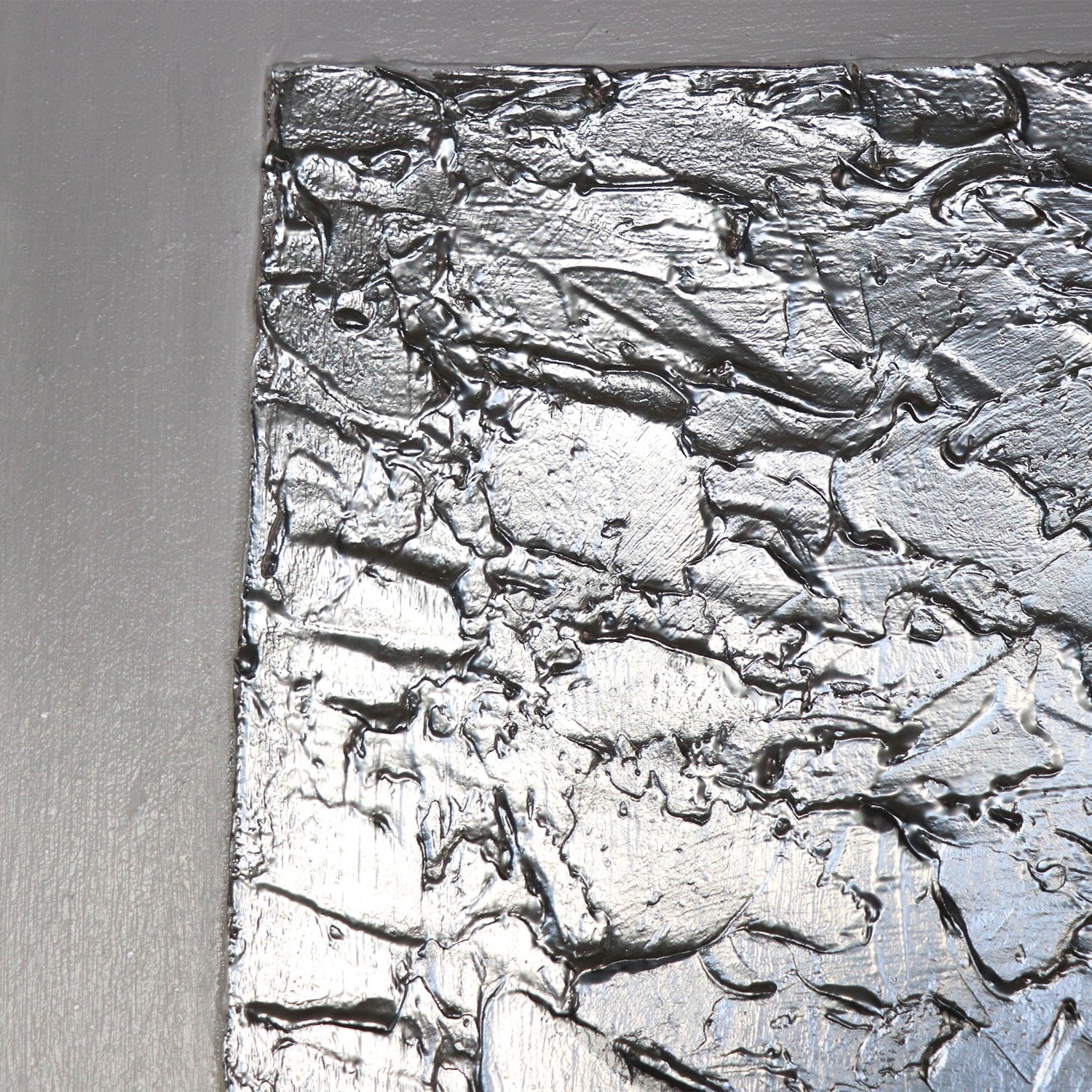 “Perfect Stability” is a modern abstract acrylic painting with a textured surface that impresses through its precise composition and minimal color palette. At its center, a silver rectangle with strong texture contrasts beautifully against smooth grey and white areas. Metallic accents add depth and elegance, while the balanced layout gives the artwork stability and harmony.