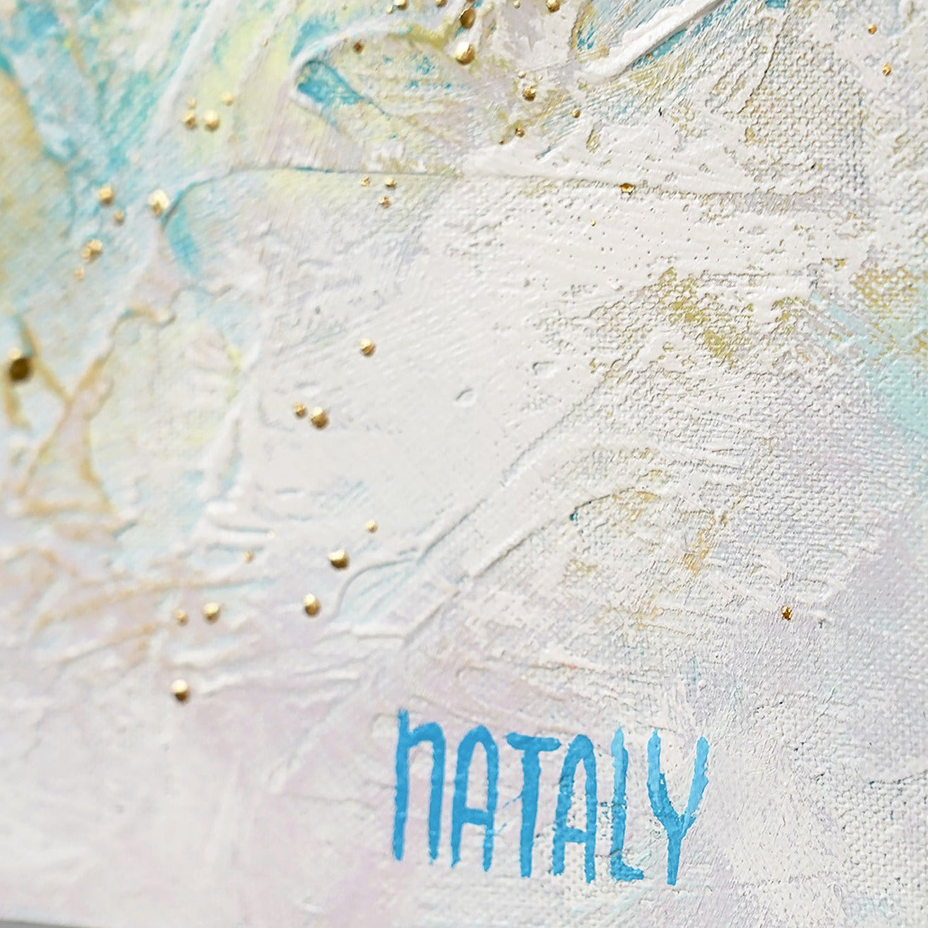 This hand-painted canvas artwork features a fascinating iguana unfolding in a vibrant world of turquoise, purple, and blue. The textured acrylic paint gives the depiction impressive depth – each scale seems alive, and every line carries movement. The bright background with cool cloud structures makes the exotic reptile appear especially vivid.