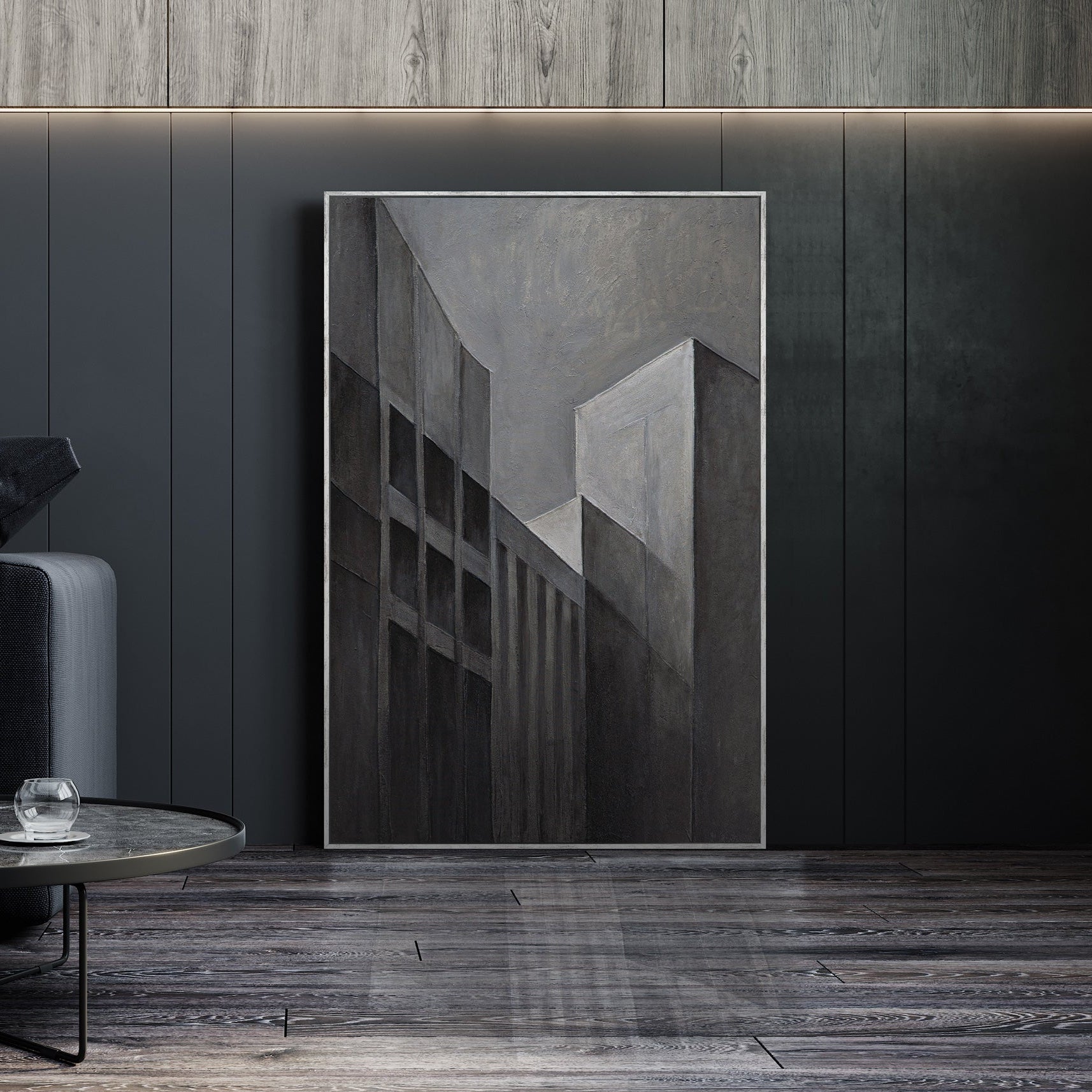Abstract framed painting “Cityscapes” – Modern acrylic painting in grey & black