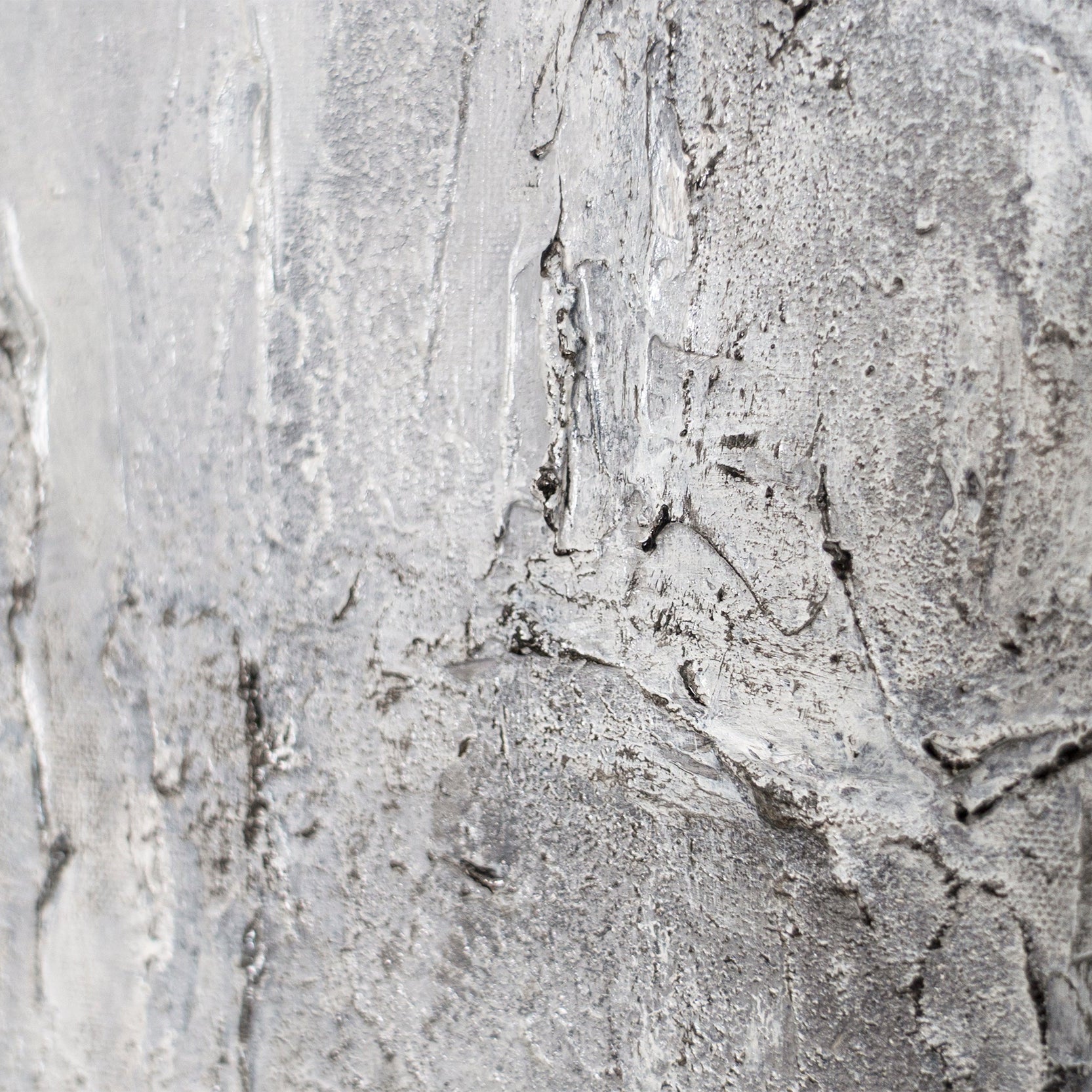 "Memory of Stone" embodies the quiet power of time and matter. Rough textures unfold in varying shades of gray, reminiscent of weathered stone and urban surfaces. The three-dimensional depth of the hand-painted relief creates a play of light and shadow that shifts with every perspective.
