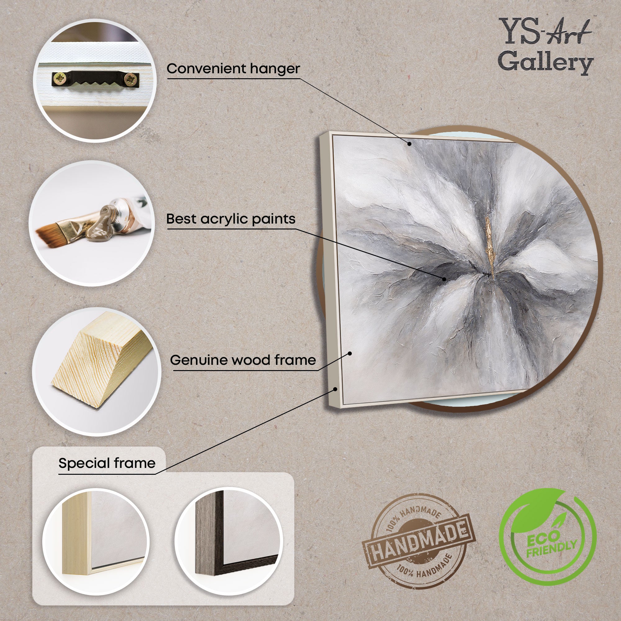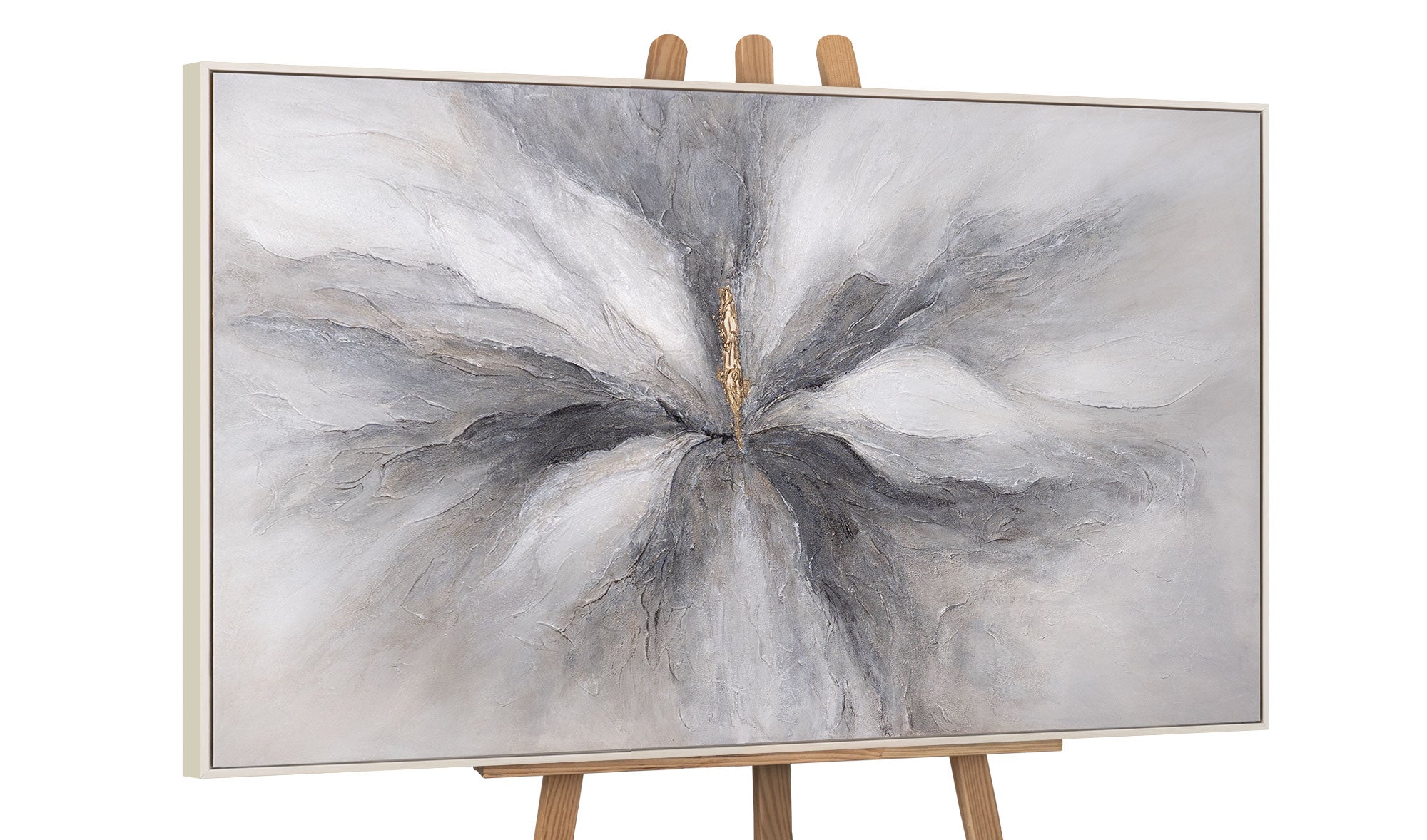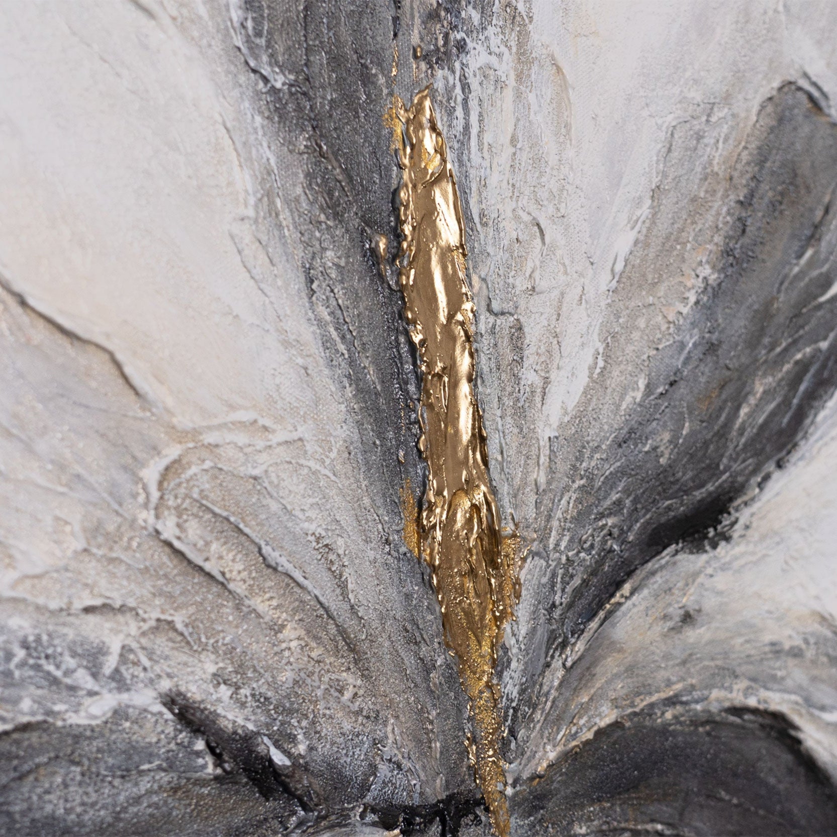 "Golden Moment" is an elegant, hand-painted acrylic painting that captivates with its timeless color combination of Gray, White, and soft Beige tones. In the center of the piece runs a golden accent that infuses the composition with noble warmth and makes the relief-like texture shine. The sculptural brushstrokes add depth and dynamism, creating a harmonious radiance full of elegance.