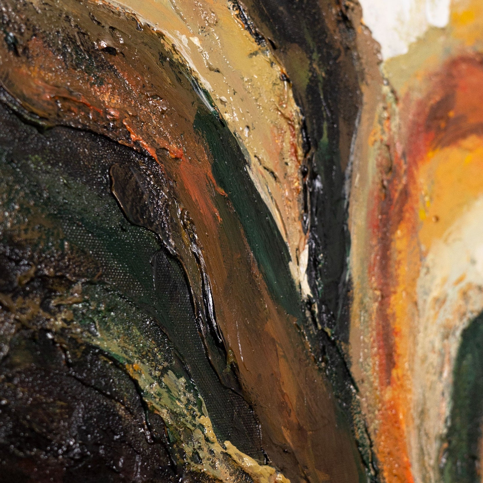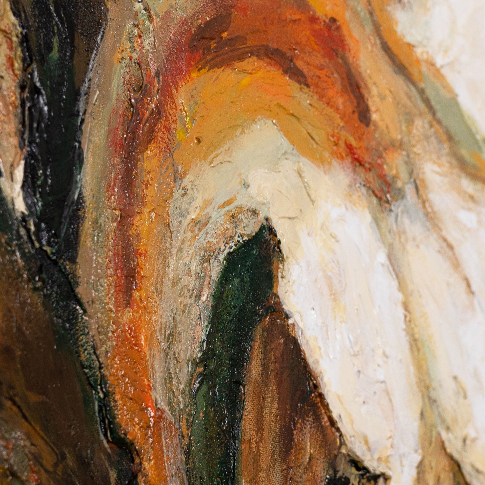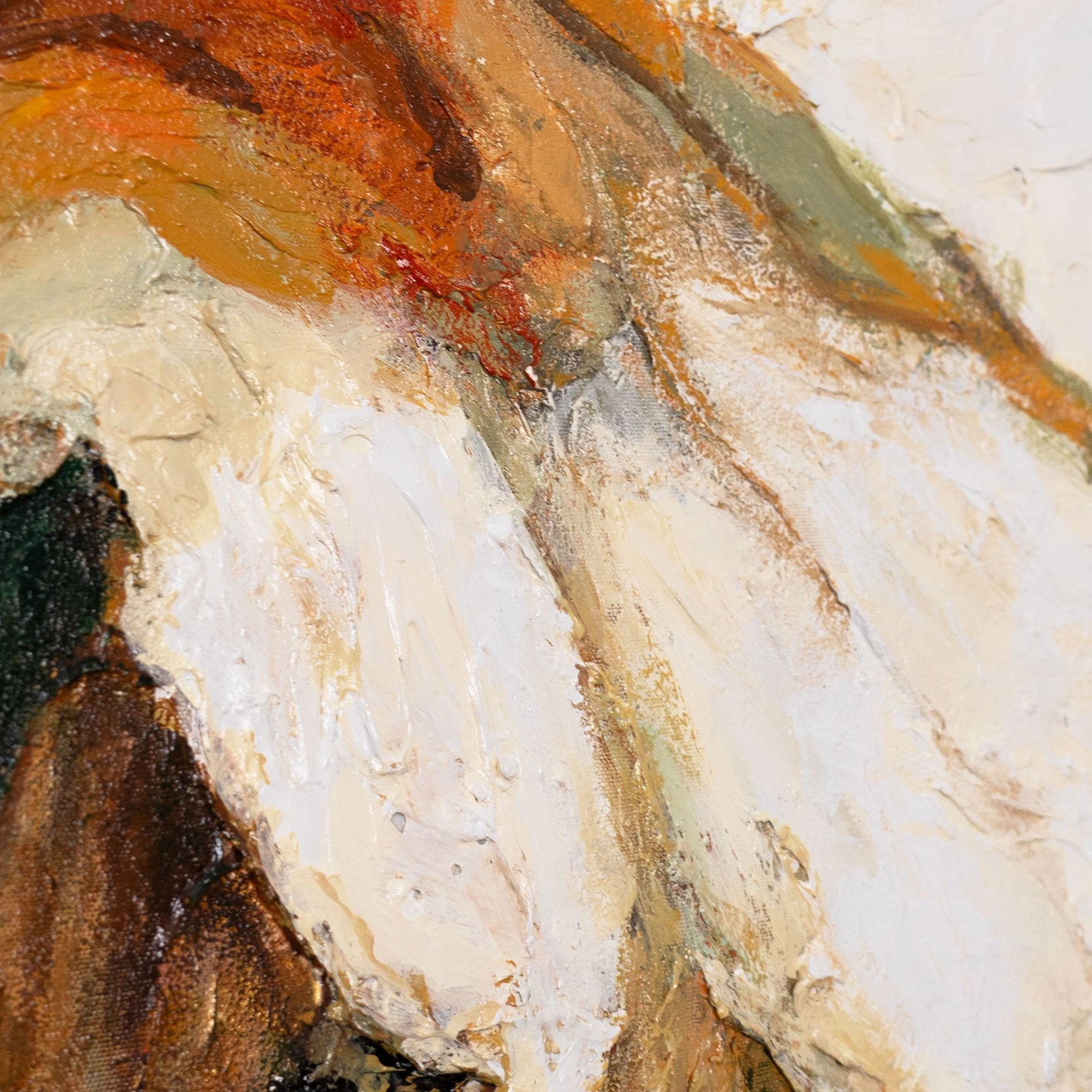 The hand-painted canvas painting "Passing of Time" features an impressive white flower, with textures and colors that create a harmonious blend of natural beauty and artistic expression. Warm Brown and Green tones, interspersed with soft Orange and Gold nuances, give the flower depth and vibrancy. The textured surface highlights the sculptural effect and makes every detail palpable.