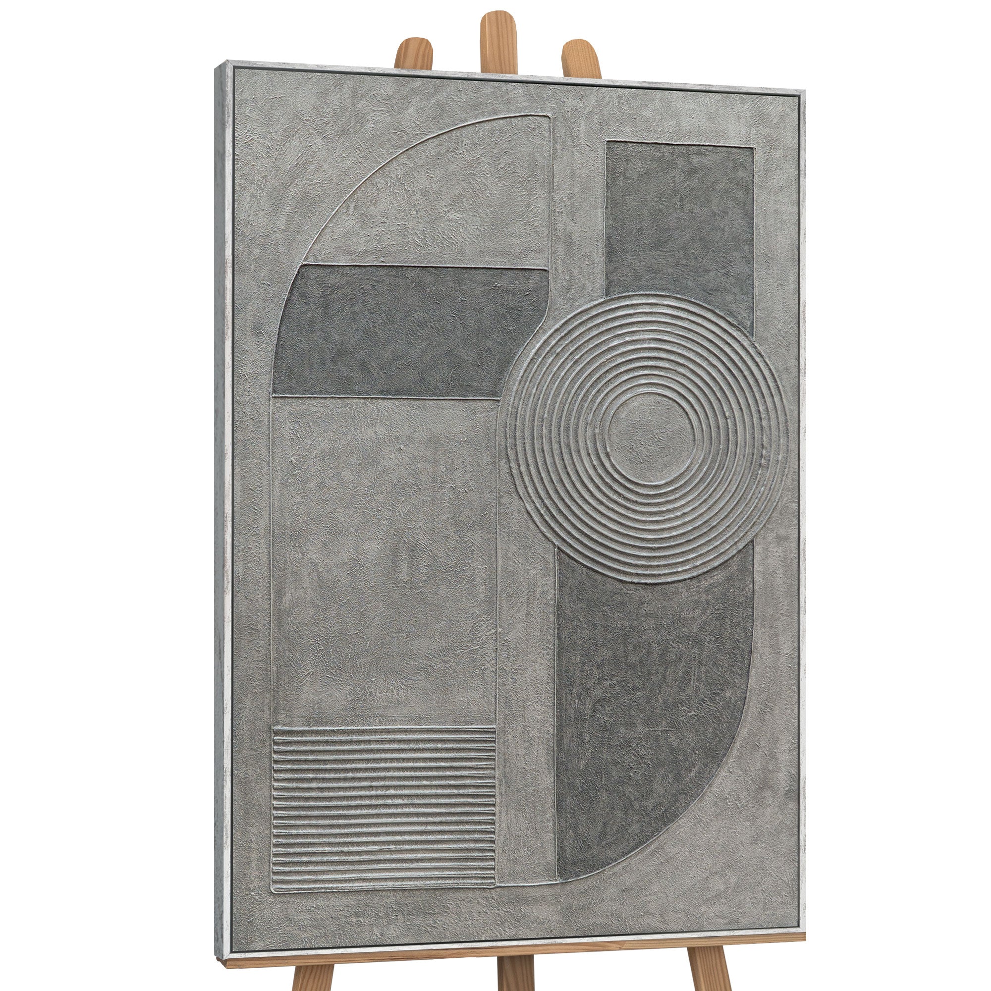 „Grauer Akkord“ vereint architektonische Klarheit mit künstlerischer Tiefe. Geometrische Formen, konzentrische Kreise und strukturierte Flächen in verschiedenen Grautönen schaffen eine harmonische Balance zwischen Präzision und Emotion. Die fein gearbeitete Oberfläche erinnert an Beton und verleiht dem Werk eine skulpturale Wirkung.