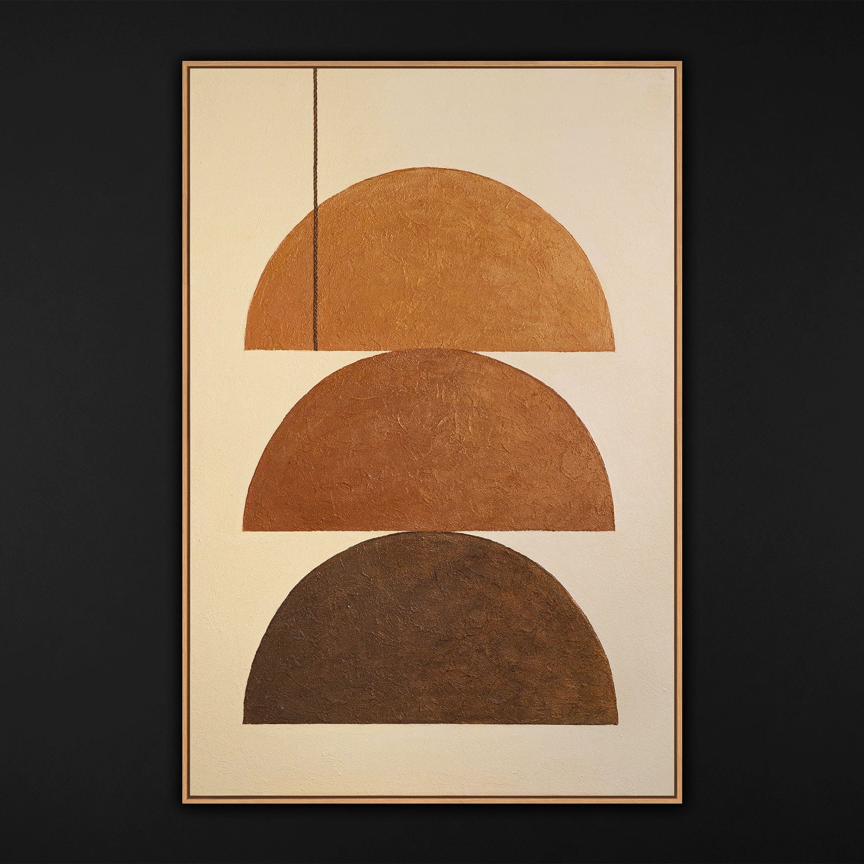 „Drei Horizonte“ ist ein modernes, handgemaltes Acrylgemälde, das durch seine klaren geometrischen Formen und harmonischen Farbabstufungen besticht. Drei Halbkreise in warmen Erd- und Brauntönen sind übereinander angeordnet und erzeugen eine minimalistische, aber zugleich kraftvolle Komposition. Die strukturierte Oberfläche unterstreicht die Tiefe des Werkes und verleiht den Farben eine besondere Lebendigkeit.