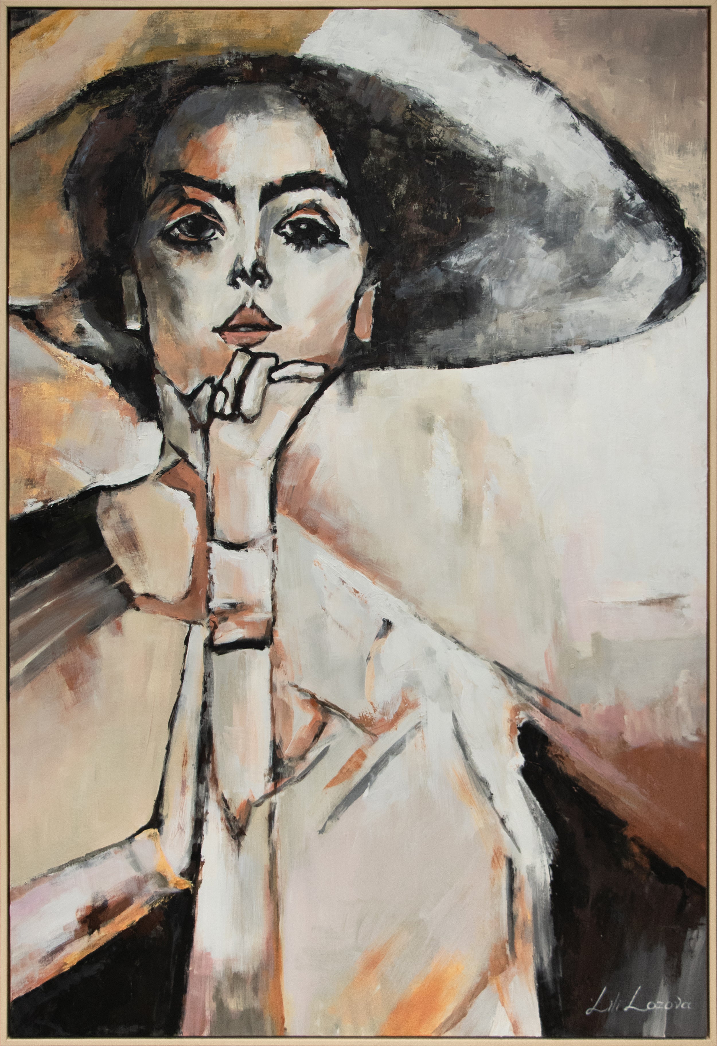 A stylish, hand-painted acrylic painting depicting an expressive woman with a wide hat in an abstract style. Soft Beige tones contrast with deep Black and subtle Rosé nuances. The confident gaze of the figure draws attention, giving the painting an elegant, timeless aura.