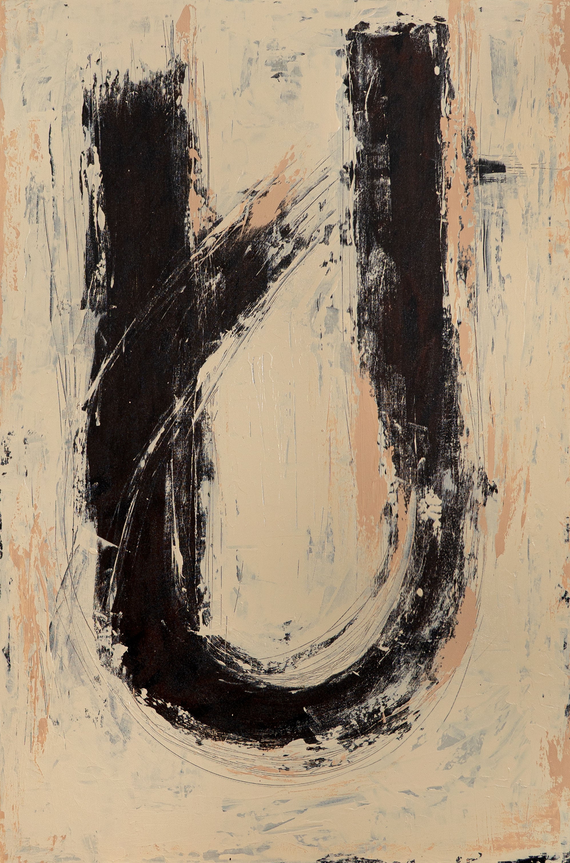 „Stille dazwischen“ ist ein Werk über den Raum zwischen zwei Momenten – über das Unsichtbare, das sich in der Stille entfaltet. In kräftigen schwarzen Pinselstrichen auf hellem Grund verschmelzen Bewegung und Pause, Ausdruck und Leere. Die rohe Struktur und spontane Geste lassen Emotion und Energie unmittelbar spürbar werden.