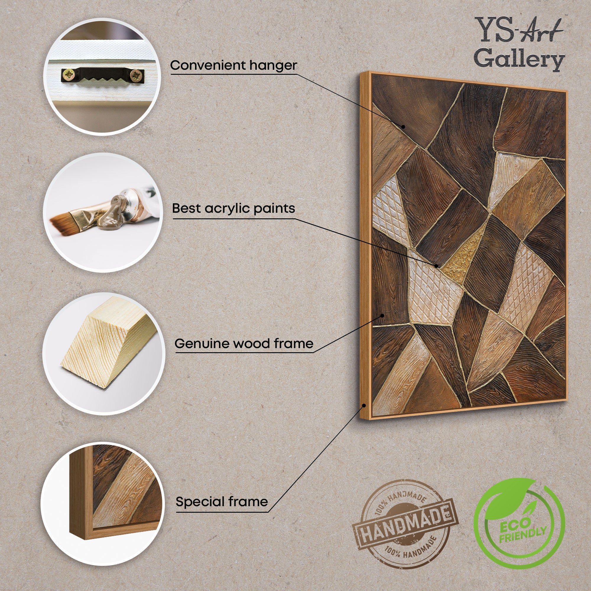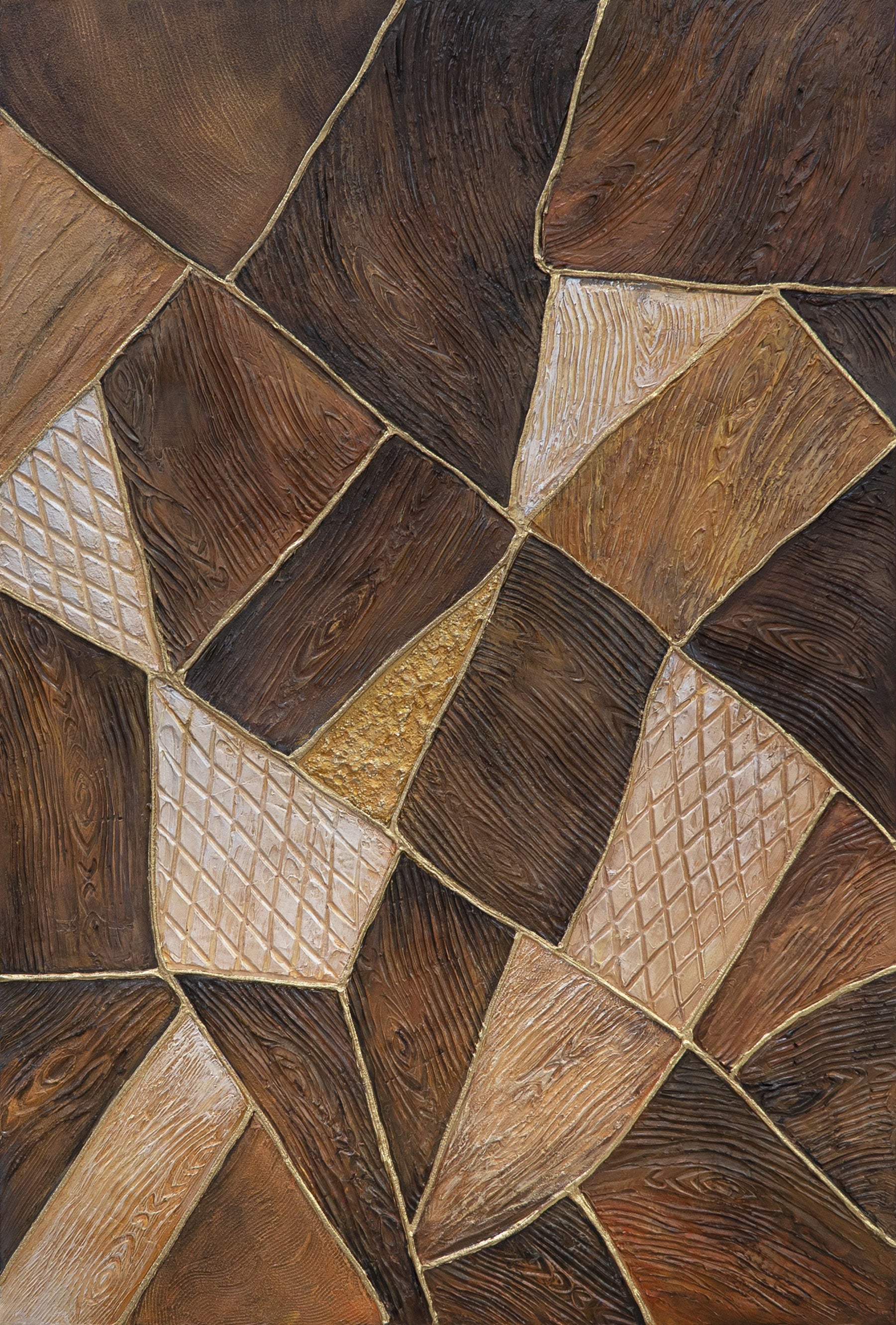 „Geometrie des Goldes“ verbindet Strenge und Wärme. In einem rhythmischen Geflecht aus geometrischen Formen treffen Holzstrukturen auf metallische Goldflächen. Jede Fläche trägt eine eigene Haptik, ein eigenes Licht – gemeinsam entstehen Bewegung, Tiefe und ein Gefühl zeitloser Balance. Das Bild erinnert an die Harmonie von Architektur und Natur, an das Spiel von Ordnung und Unregelmäßigkeit.
