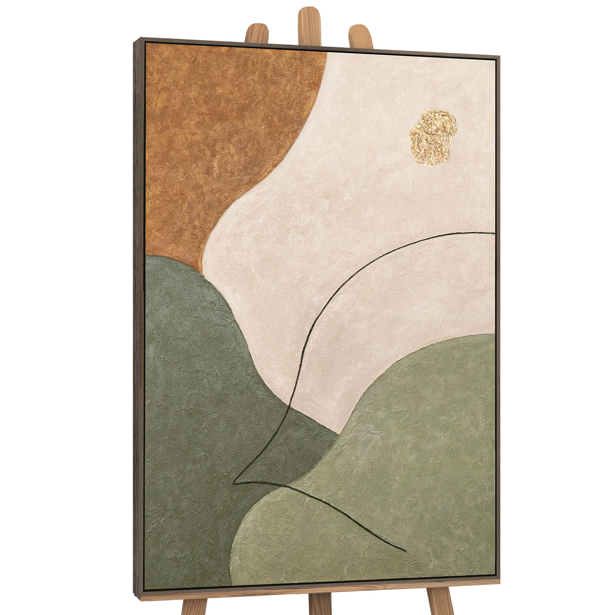 Bringen Sie Eleganz und Ruhe in Ihr Zuhause mit diesem handgefertigten abstrakten Wandbild. Die harmonische Kombination aus warmem Braun, sanftem Beige, beruhigendem Grün und einem goldenen Akzent macht dieses Gemälde zu einem echten Blickfang.