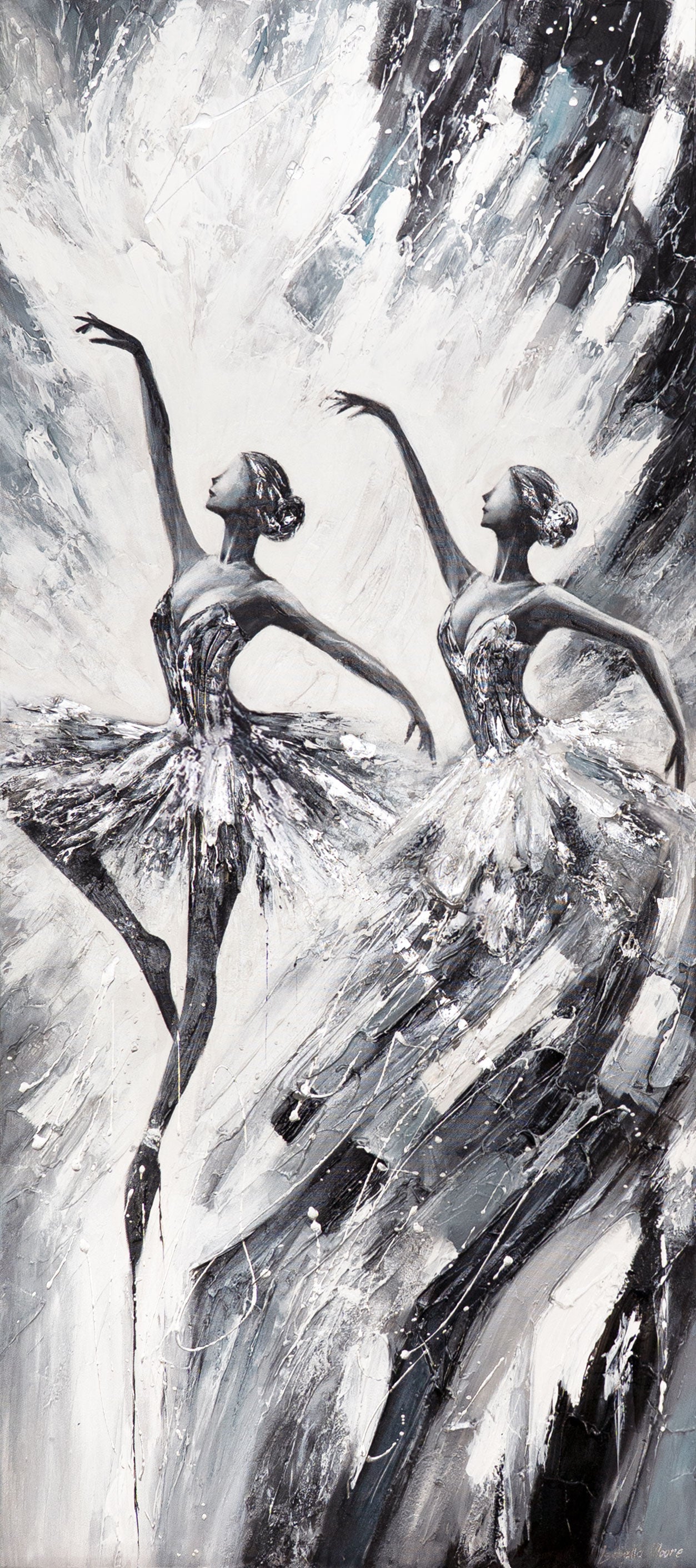 "The Power of Grace" is a hand-painted acrylic painting on canvas, depicting two ballerina figures in dynamic lightness with expressive brushstrokes. The reduced color palette of black, white, and gray gives the piece a timeless feel while emphasizing movement.
