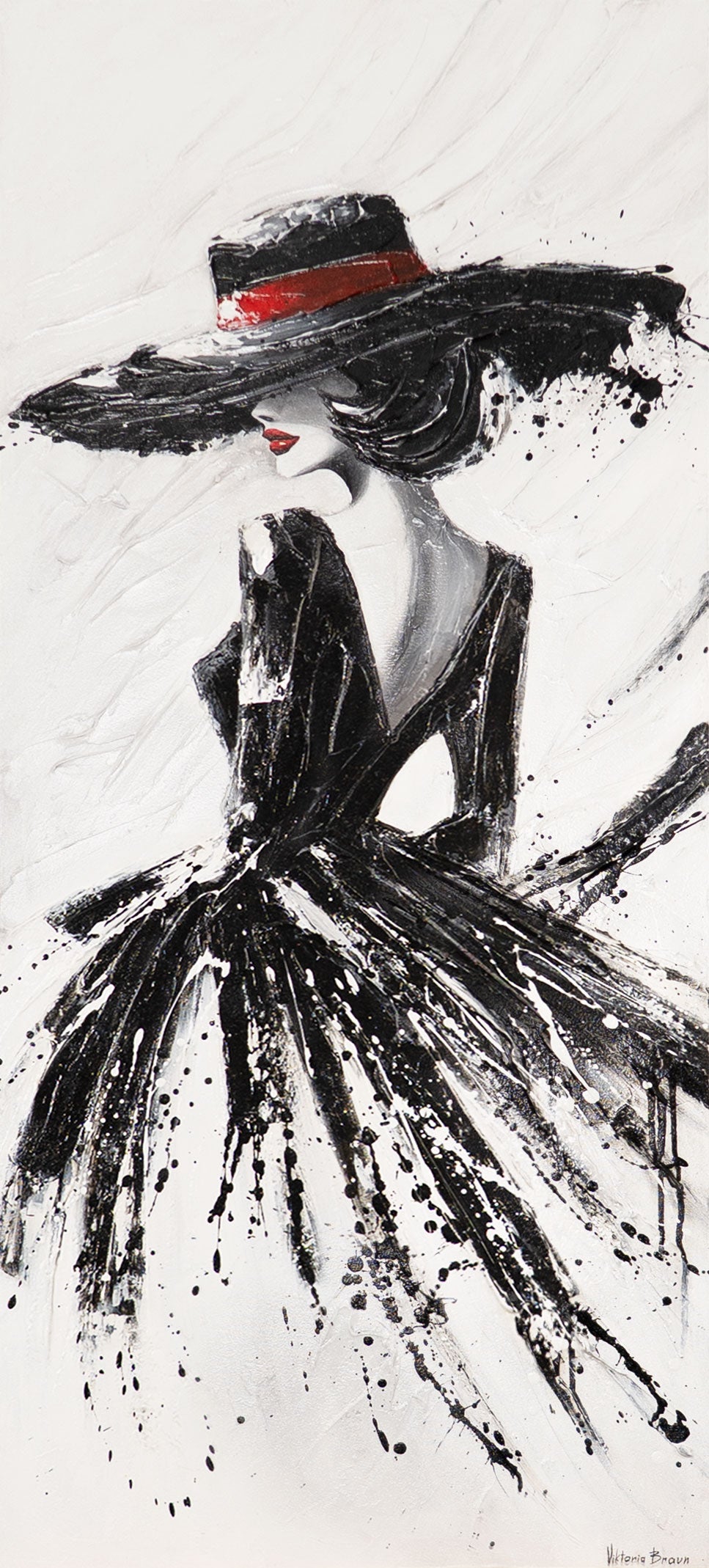 "The Lady" is a hand-painted acrylic painting on canvas, featuring a stylized woman in an elegant black dress with a wide-flowing skirt and distinctive hat. The red accent on the hat makes a clear feminine statement and adds a touch of drama to the monochrome artwork. The textured brushstrokes enhance the dynamic and bring movement to the canvas.