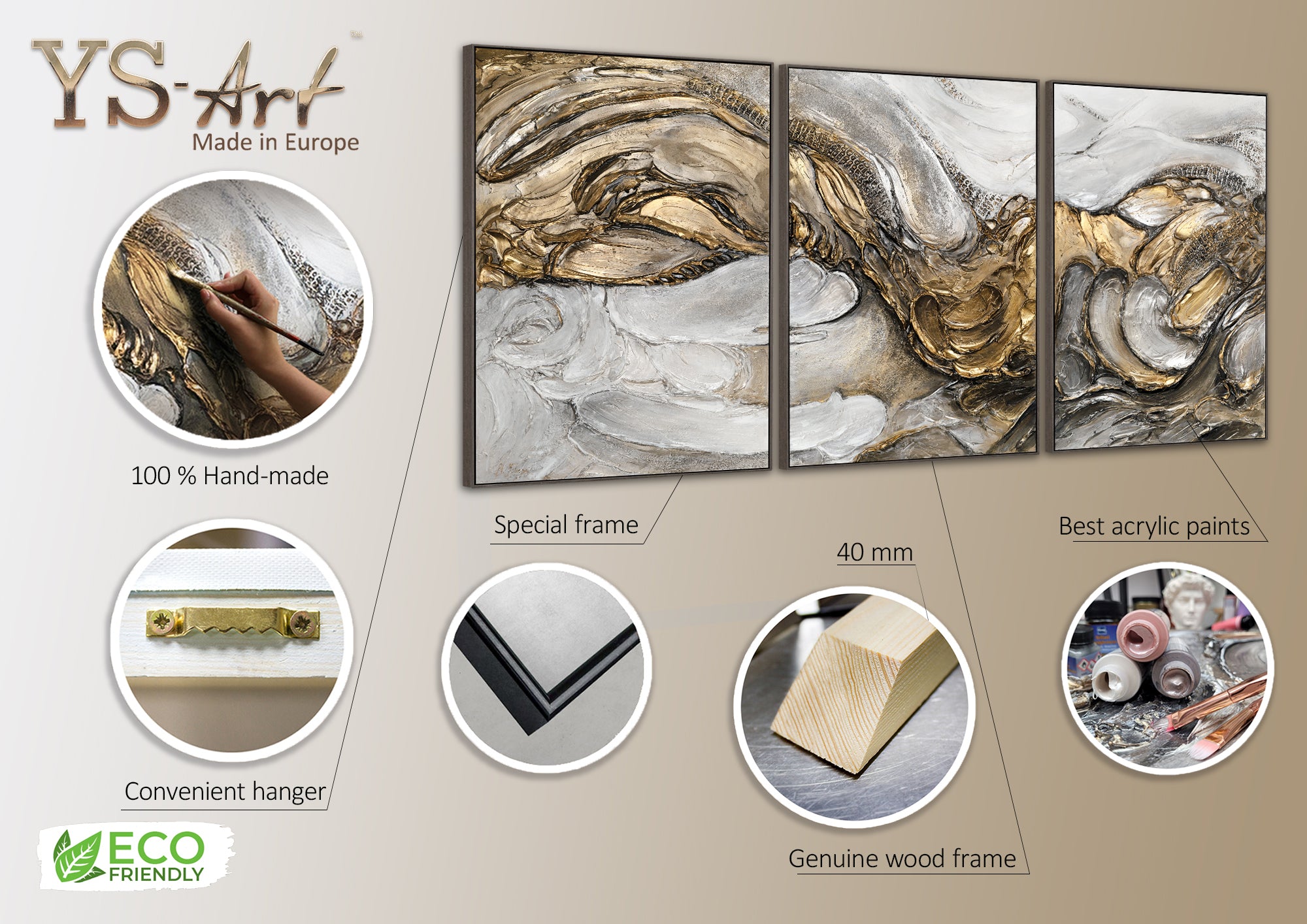 This exclusive hand-painted triptych impresses with its dynamic structure and refined gold and silver tones. The three-part composition creates an expressive wall decoration, adding a luxurious and modern atmosphere to your living space. The intricately textured surface adds depth and uniqueness to the artwork.