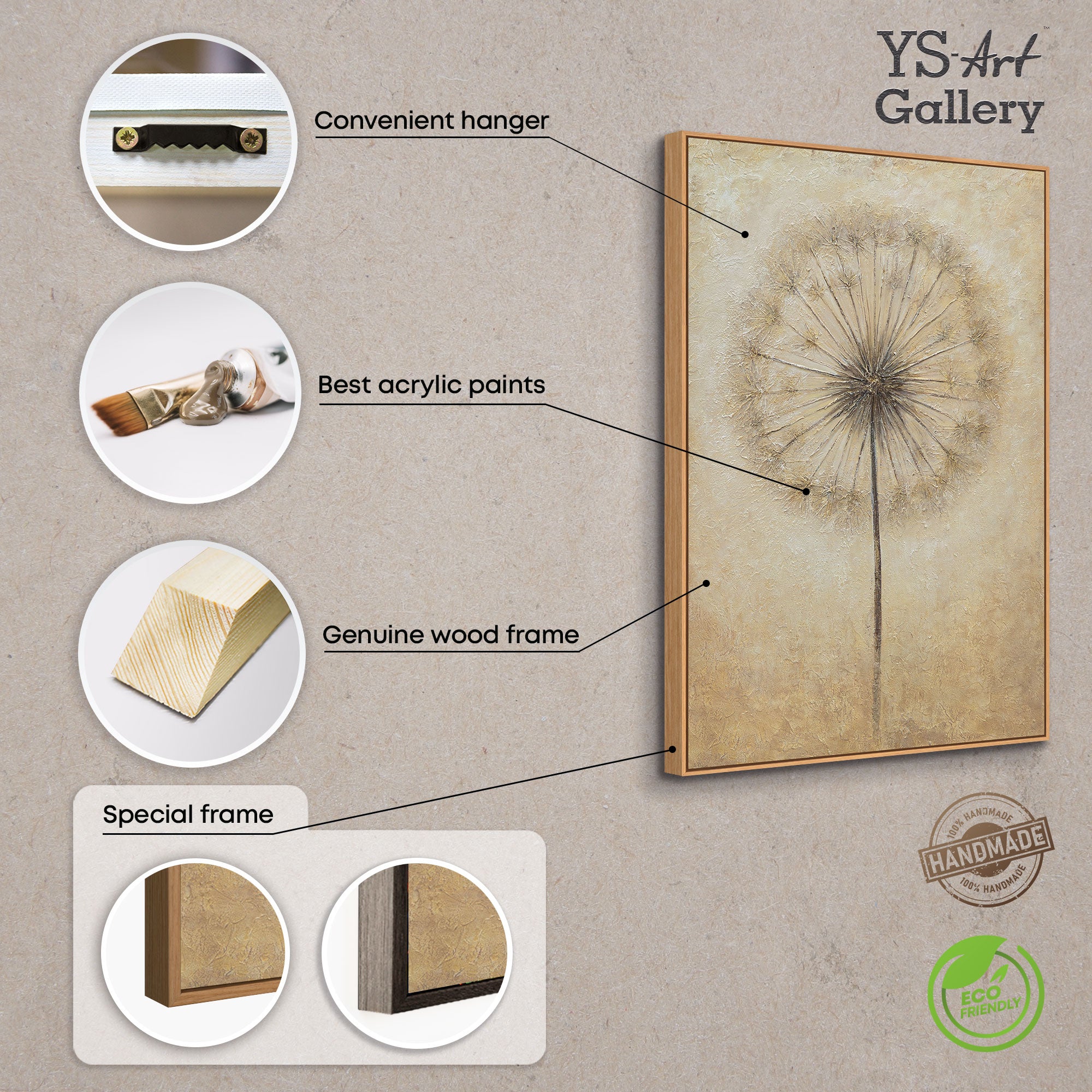 „Atem des Sommers“ fängt den flüchtigen Moment eines Sommerwinds ein. Eine filigrane Pusteblume erhebt sich aus sanften Beige- und Cremetönen, ihre feinen Linien und plastischen Strukturen wirken wie gefrorene Bewegung. Das Licht spielt auf der Oberfläche, lässt jede Spur lebendig erscheinen – ruhig, poetisch, beinahe meditativ.