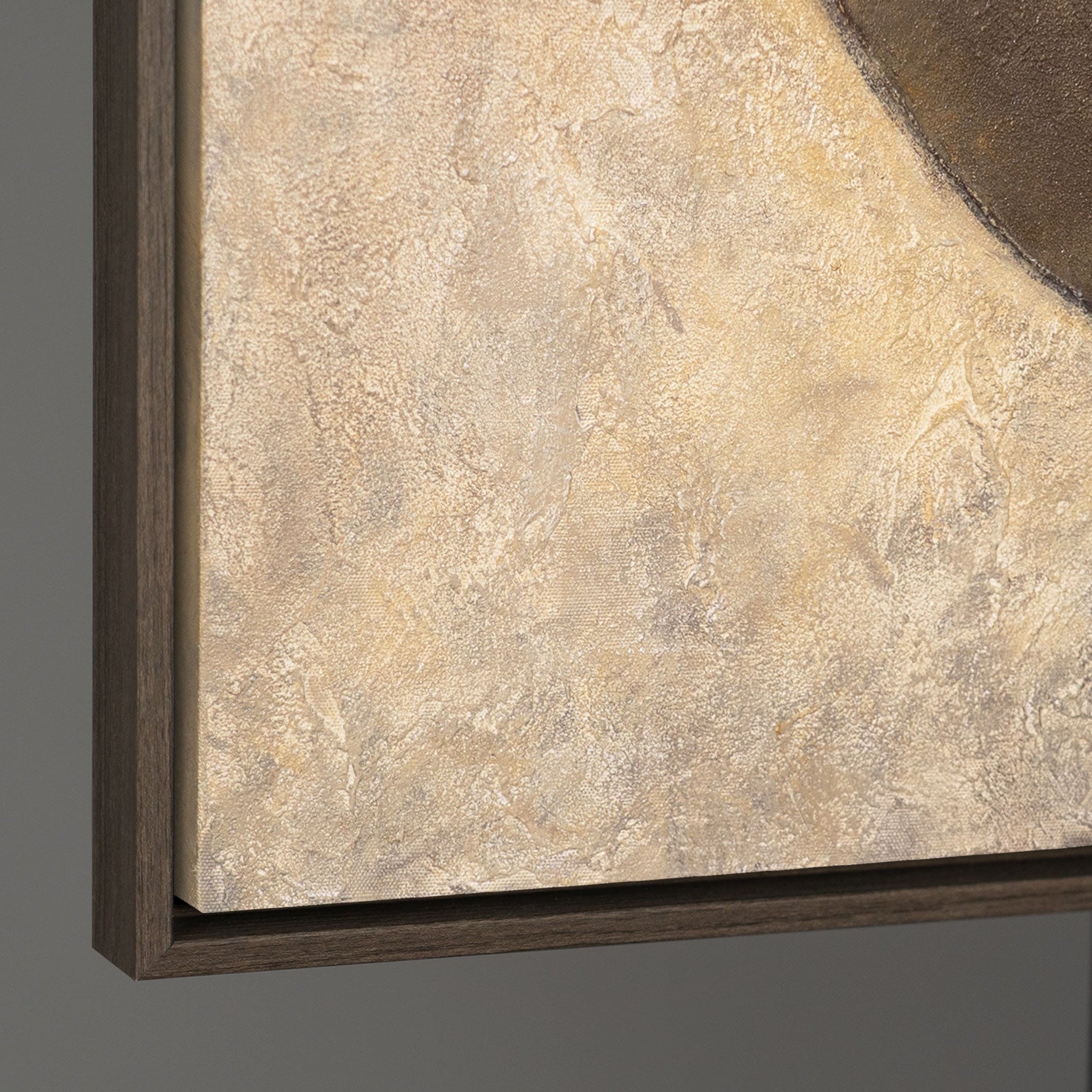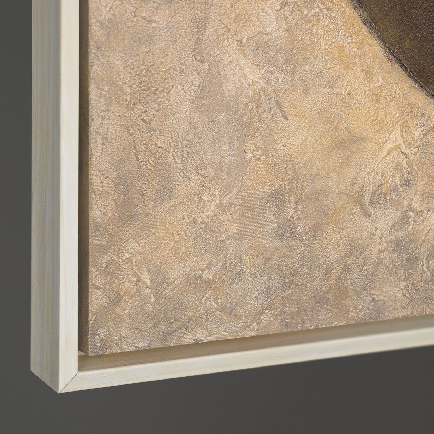 „Duett der Halbkreise“ zeigt eine harmonische Komposition aus zwei großen Halbkreisformen, die in kontrastierenden Beige-, Creme- und Dunkeltönen gestaltet sind. Die strukturierte Oberfläche verleiht dem Kunstwerk Tiefe und eine taktile Präsenz, während die sanft modellierten Übergänge eine ruhige, ausgewogene Wirkung erzeugen. Die geometrische Formensprache wirkt modern und zugleich zeitlos, wodurch das Bild sowohl als eleganter Akzent als auch als ruhiger Mittelpunkt im Raum funktioniert.