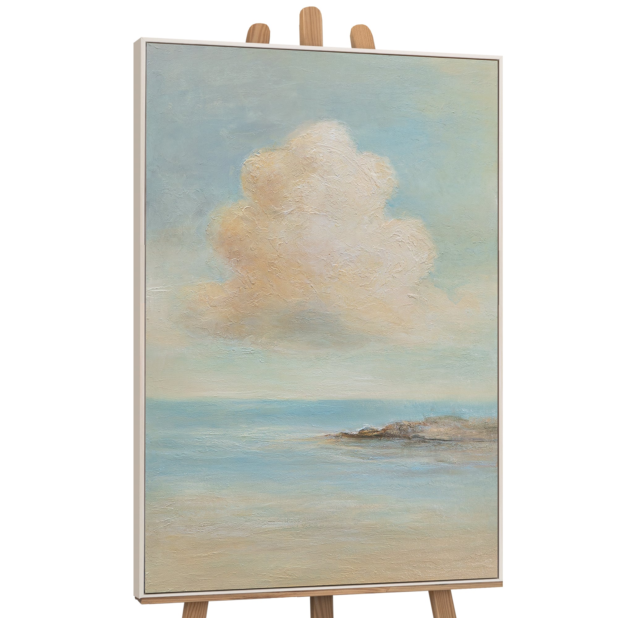 „Leichtigkeit des Seins“ verkörpert den Moment der vollkommenen Ruhe. Eine weiche Wolkenformation schwebt über dem zarten Blau des Meeres, während feine Strukturen und Pastelltöne von Beige und Creme das Licht sanft reflektieren. Die handgemalte Oberfläche lässt das Bild lebendig wirken und füllt den Raum mit friedlicher Energie.