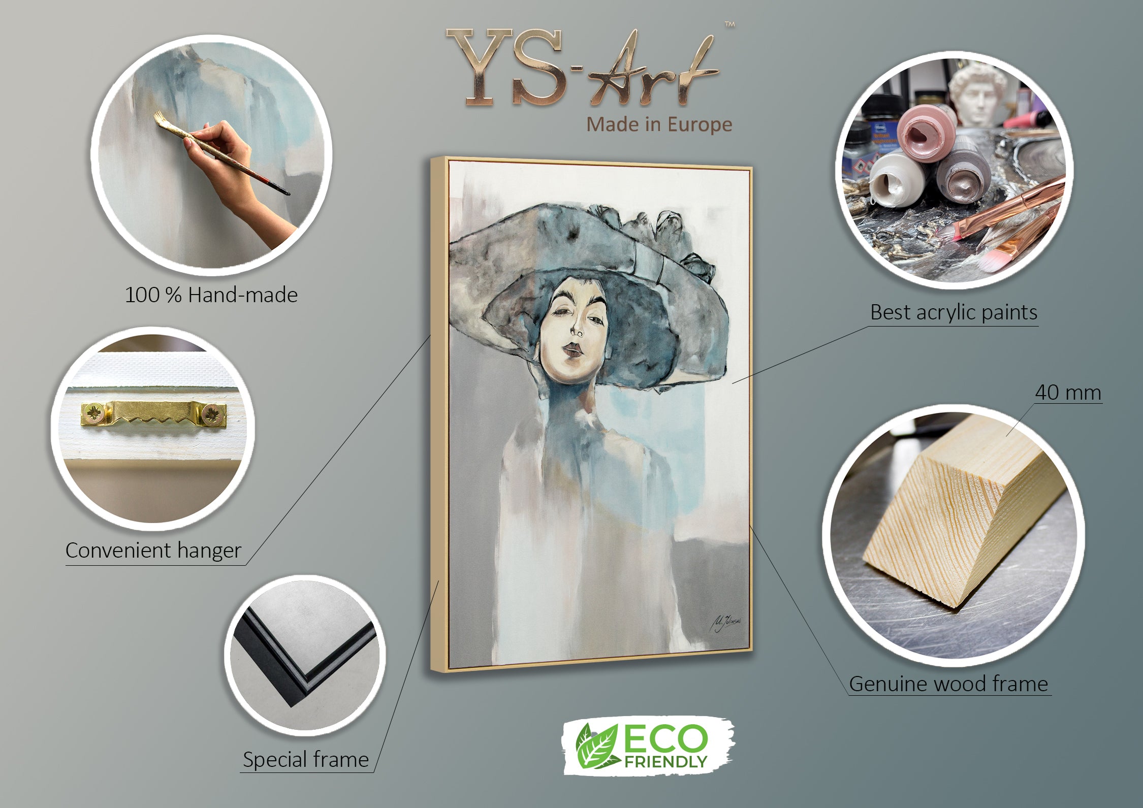 • We paint all of our paintings with high-quality acrylic paints. The colors are harmless to health and, above all, environmentally friendly. We stretch the canvas on a natural wood wedge frame. So that the acrylic paints on the painting remain saturated for many years, we refine the surface with water-based lacquer.